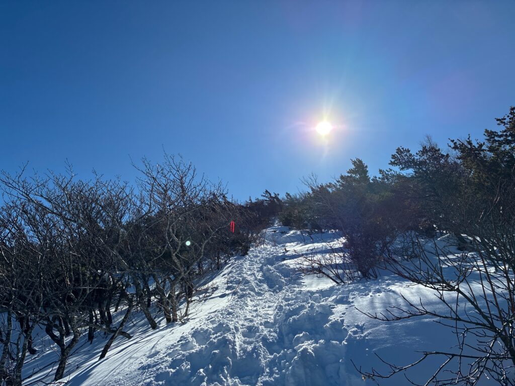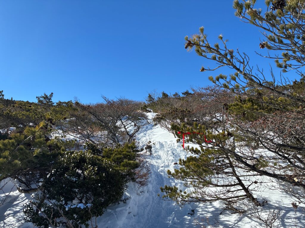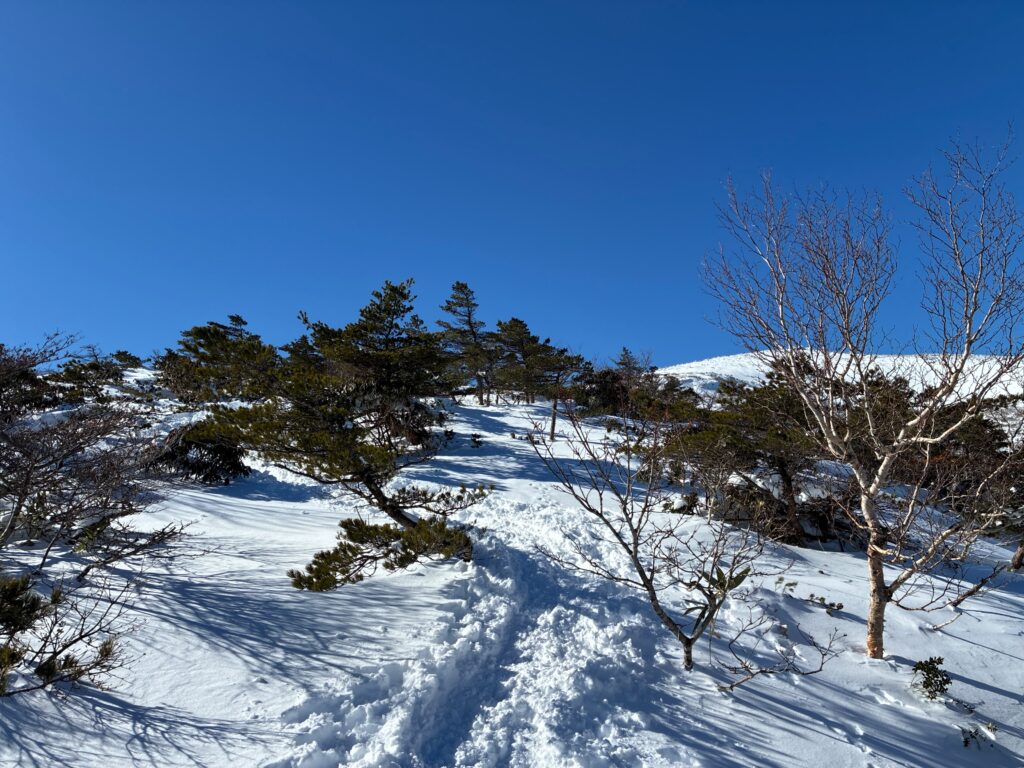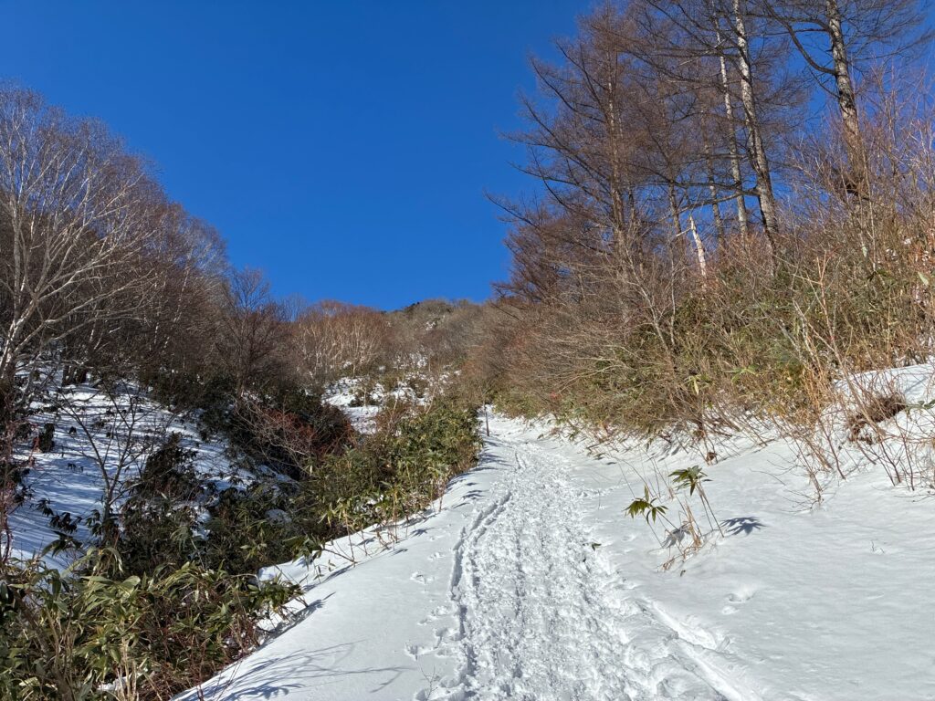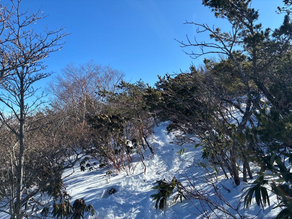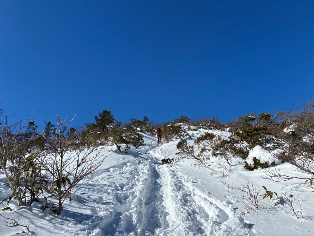 山頂手前は登山道を外れて直登。冬ならではのショートカットです。