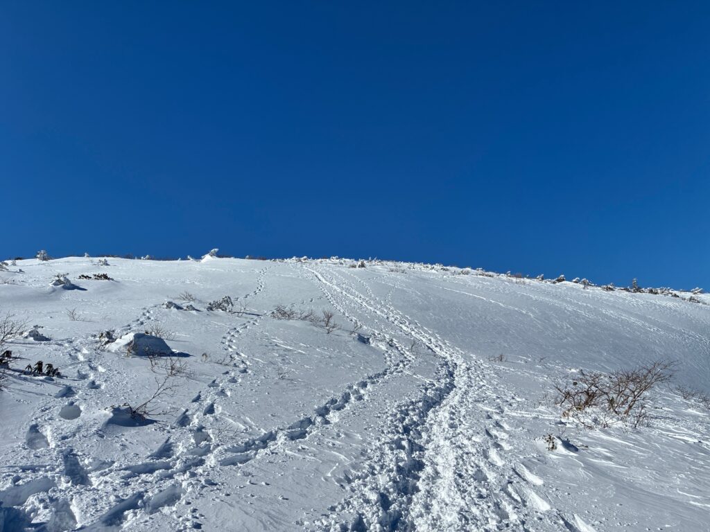 勾配のある登りにもしっかりトレースがあり、アイゼン無しで登れます。