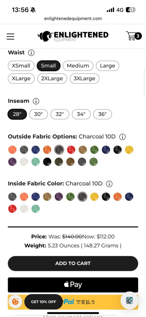 エンライトイクイップメント公式にアクセスし、製品(カスタムオーダーの場合はカスタム内容も)を選択してカートに入れていきます。英語表記ということ以外は、日本国内でのネットショッピングと変わりません。