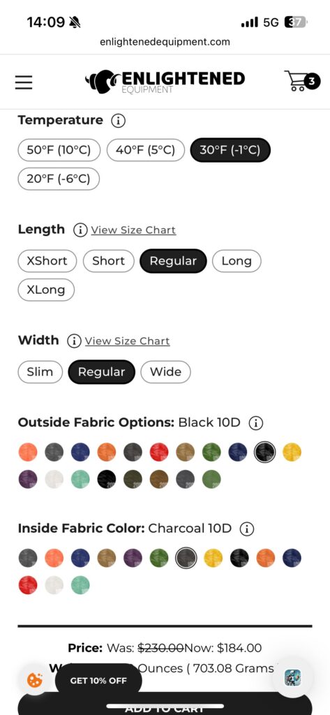 キルトは対応温度、長さ、幅、表地、裏地を選択することができます。標準的な日本人体型ならShort、Slimでも入ると思いますが、色々理由もあり自分はRegularにしています。