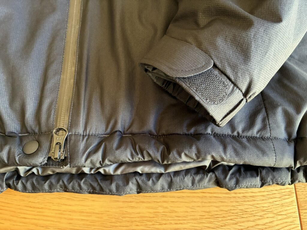 袖口はベルクロ、裾はポケット内のドローコードと裾下内部のボタンで調整可能。