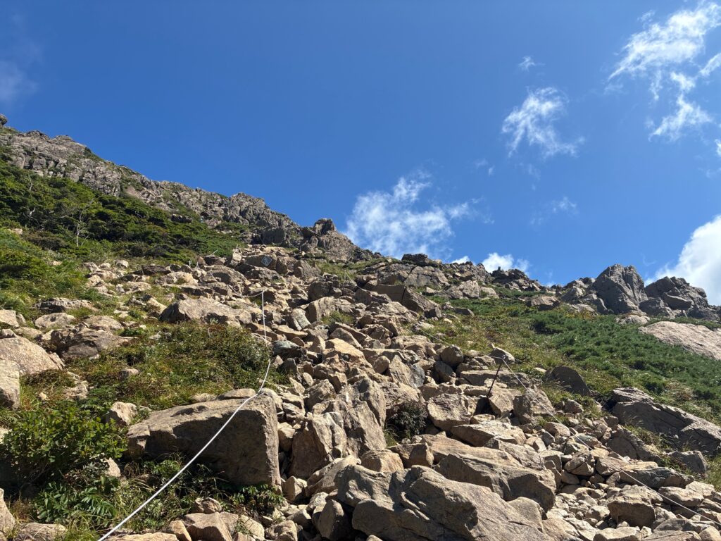 登りの岩場には表面が黒光りしている蛇紋岩という岩が混ざっており、これがかなり滑りやすく、登山靴のグリップ力でも滑るため注意です。