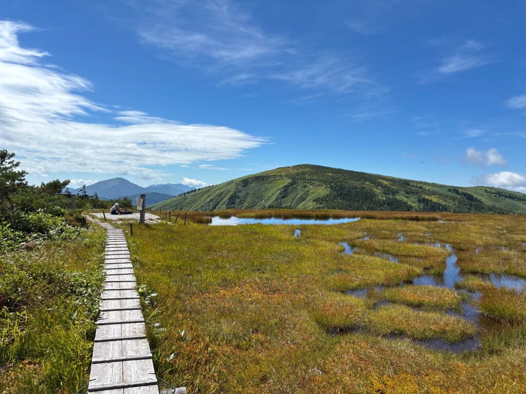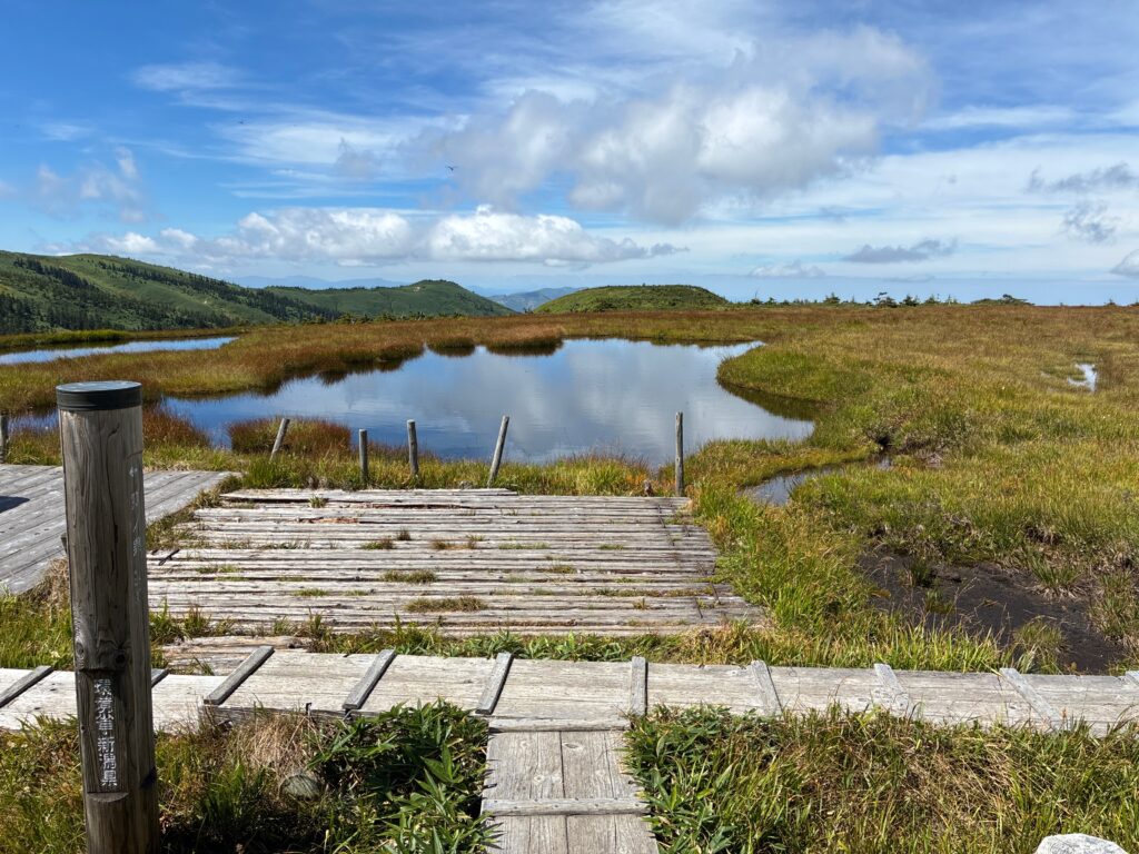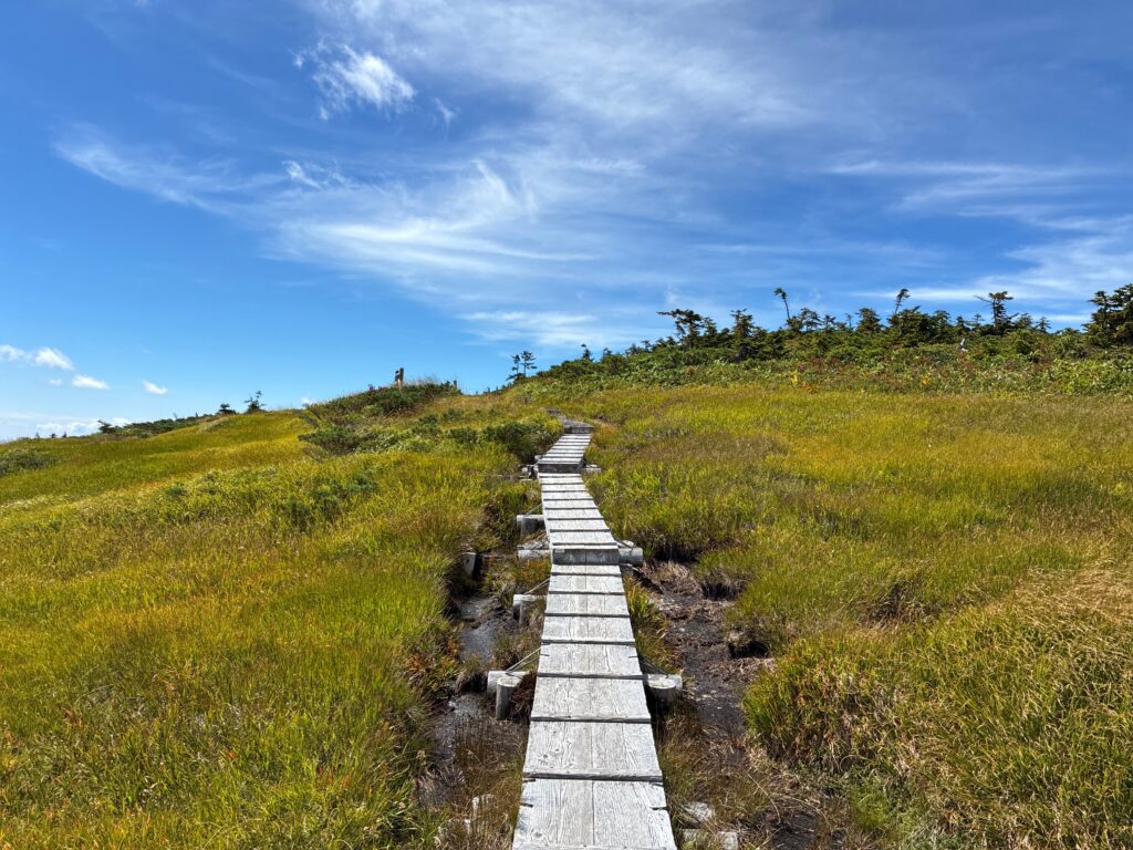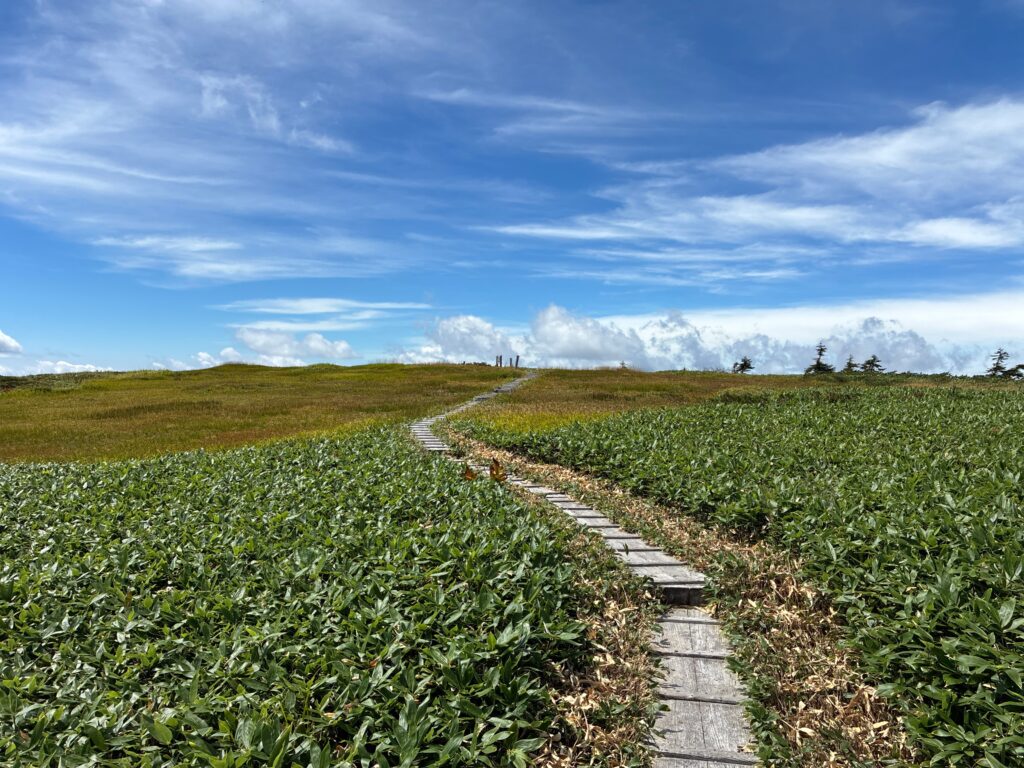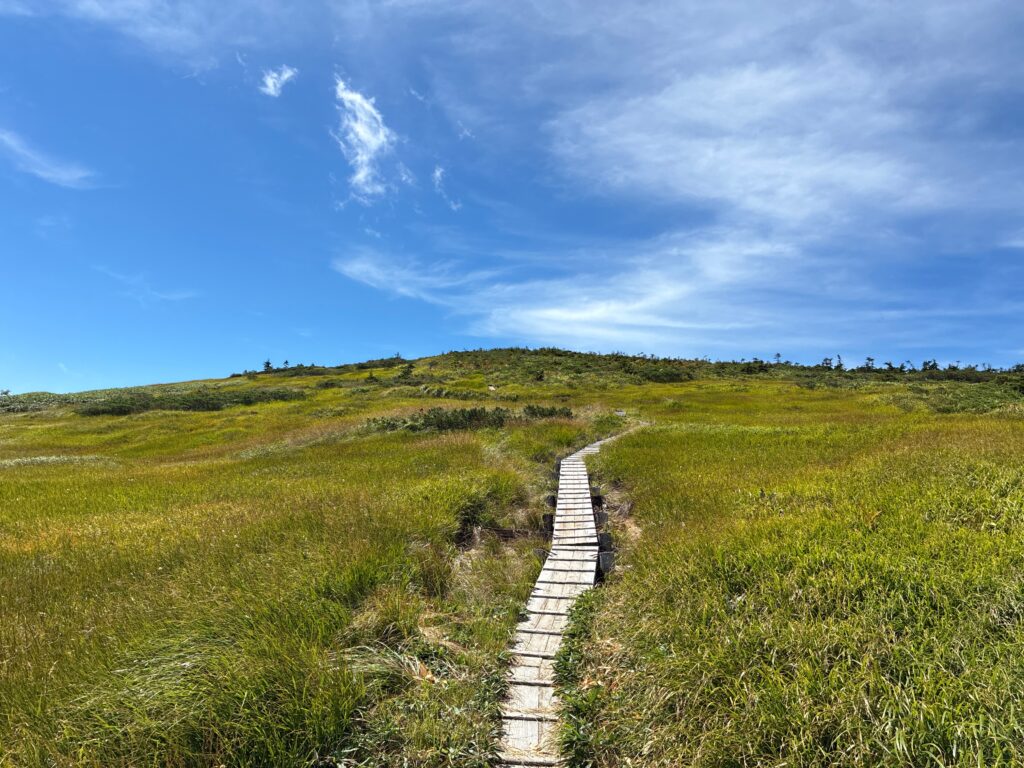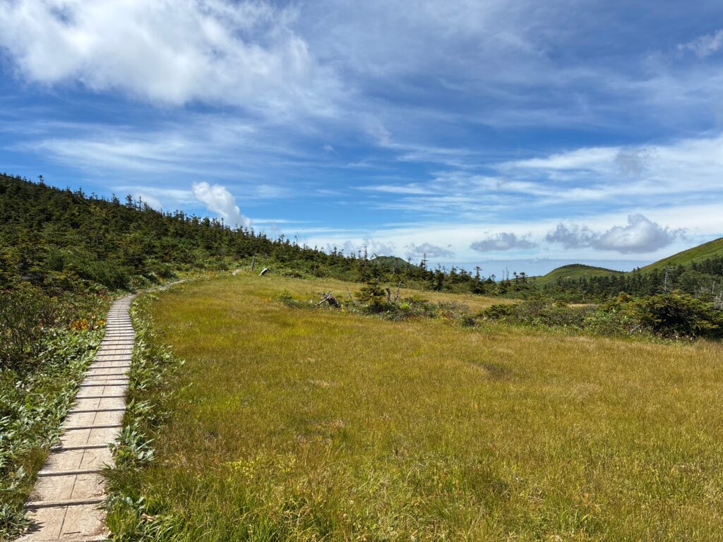 この標高で山頂付近が広大な湿原になっているのは新鮮で、空に向かって歩いている感覚!