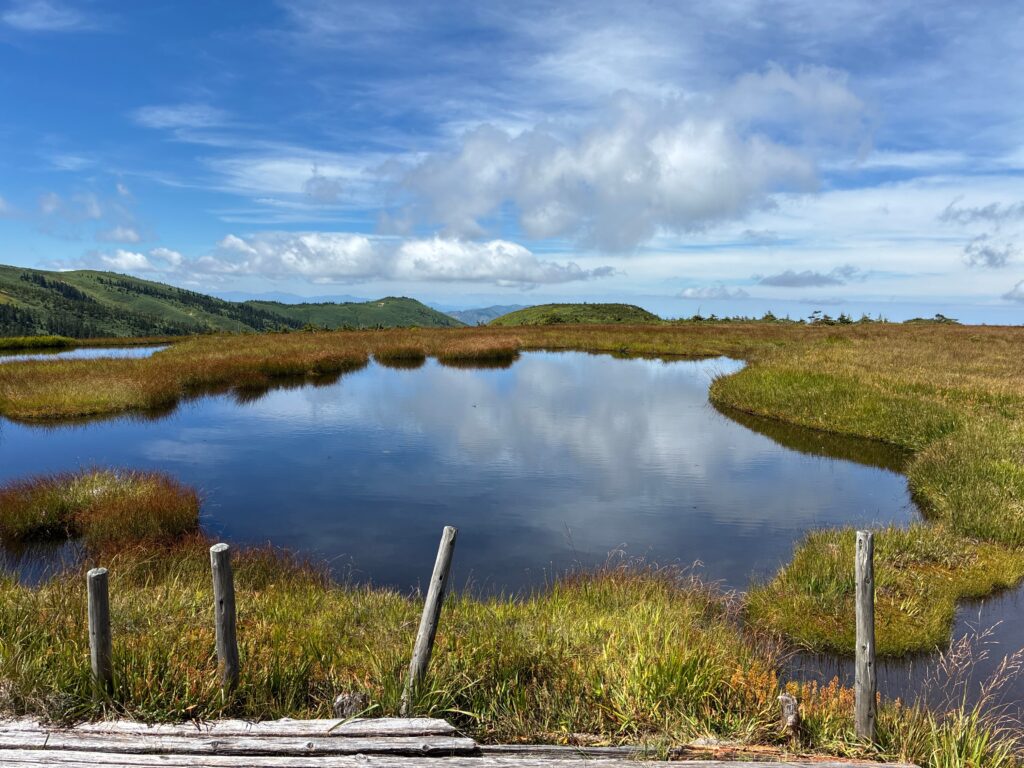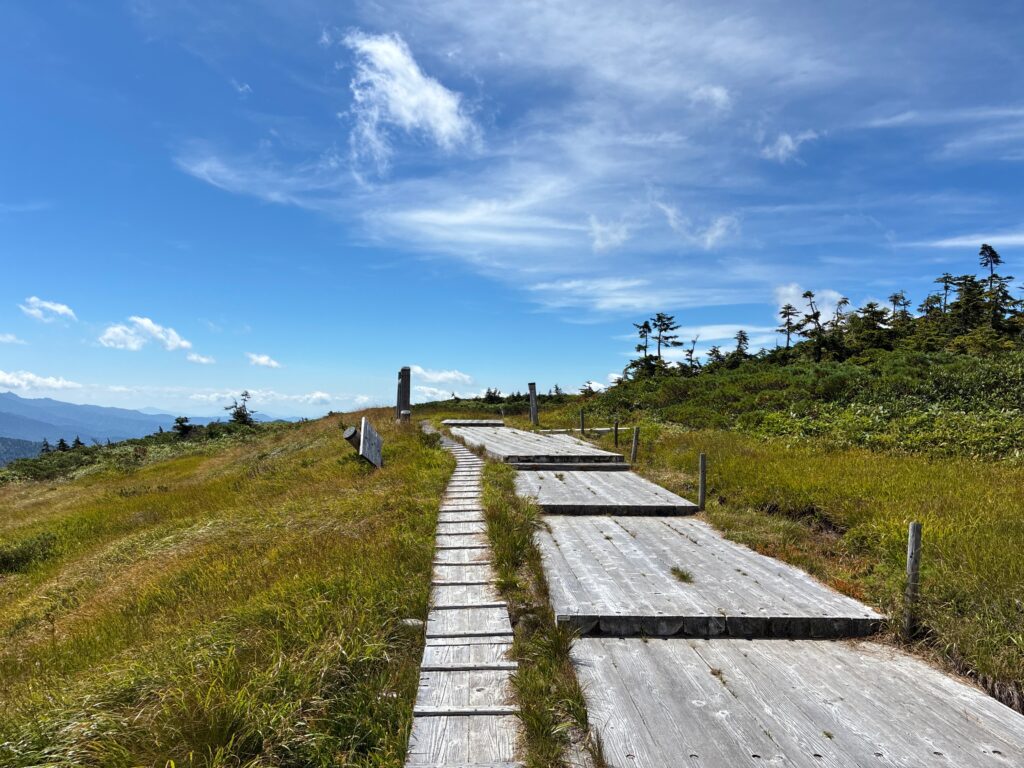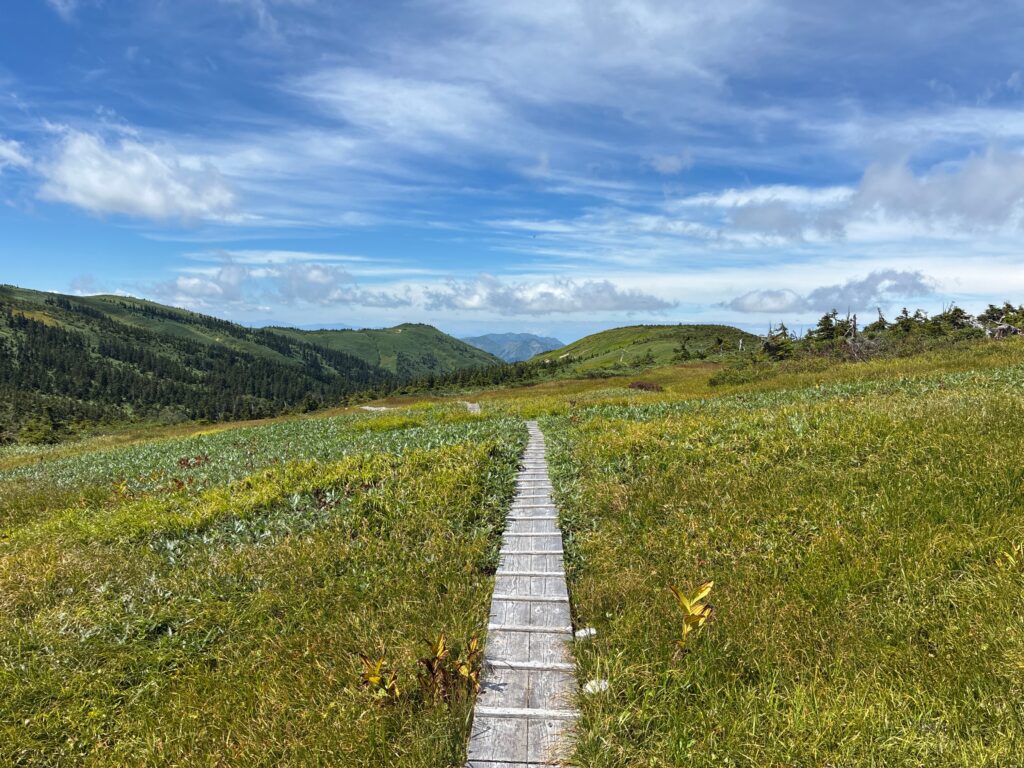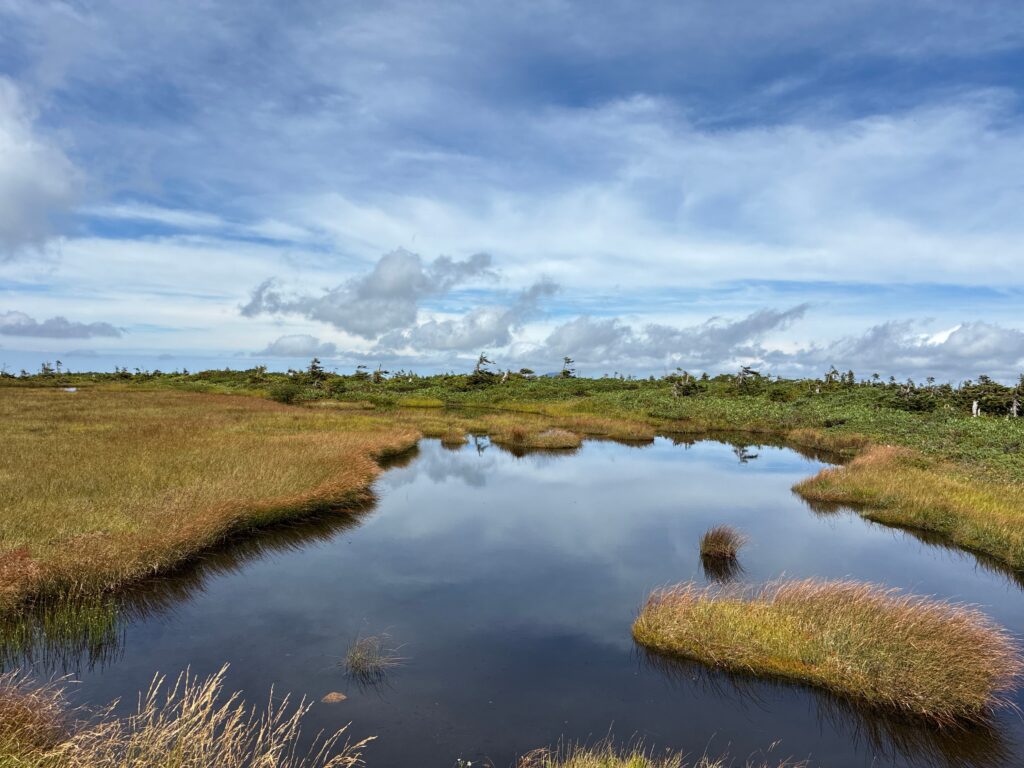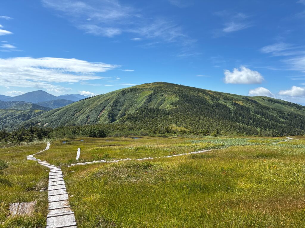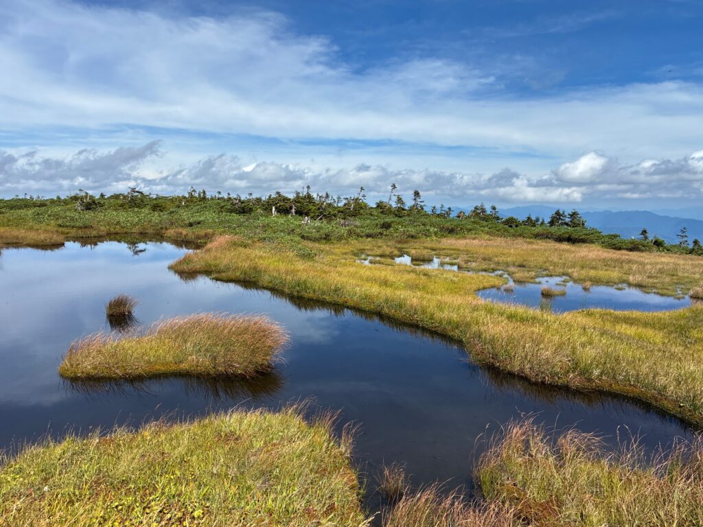 この標高で山頂付近が広大な湿原になっているのは新鮮で、空に向かって歩いている感覚!