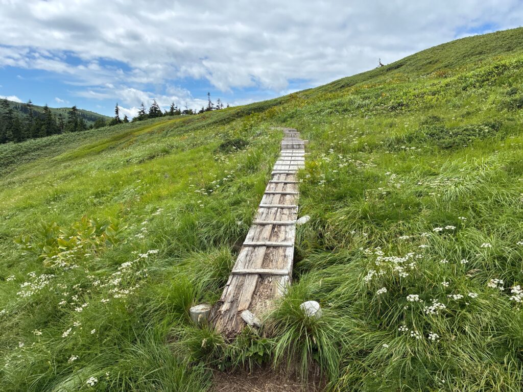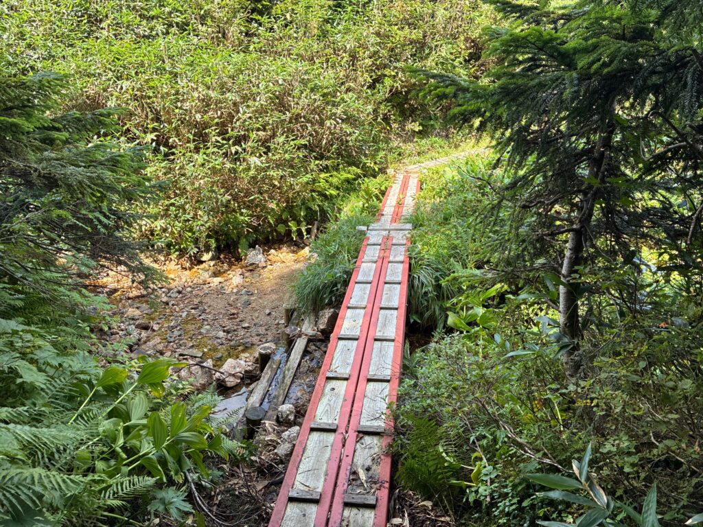 少し進むと平ヶ岳山頂前の湿原に出ます。