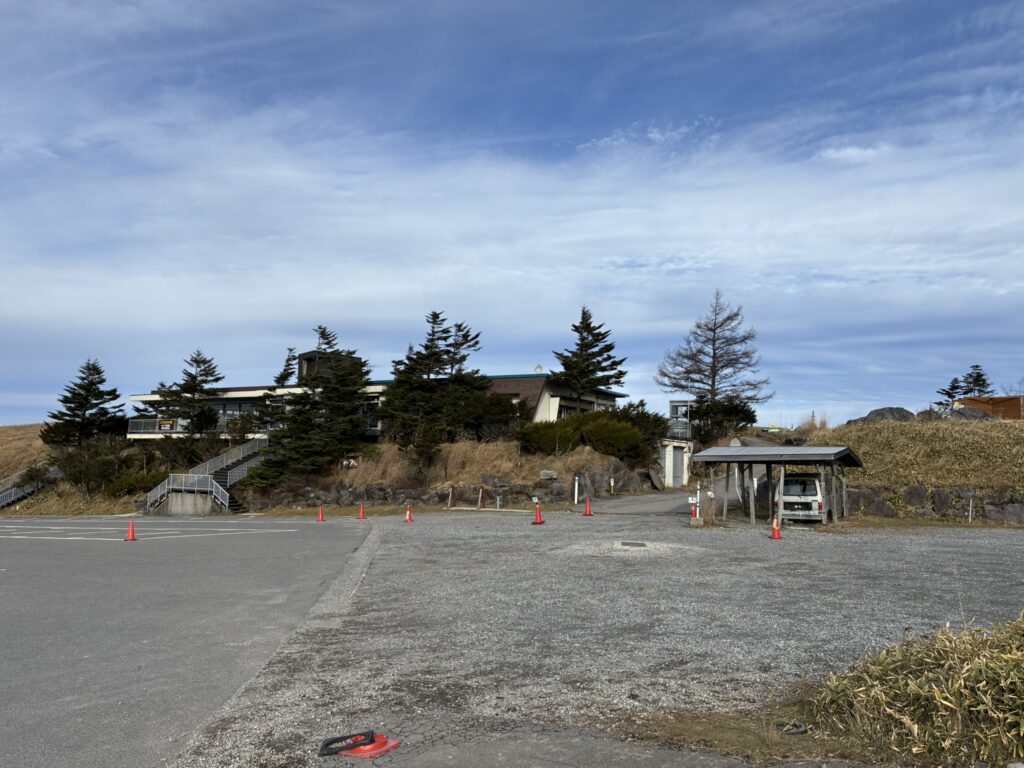 駐車場前にあるレストランは冬季休業中。奥にあるバイオトイレも合わせて使用不可になっていました。
