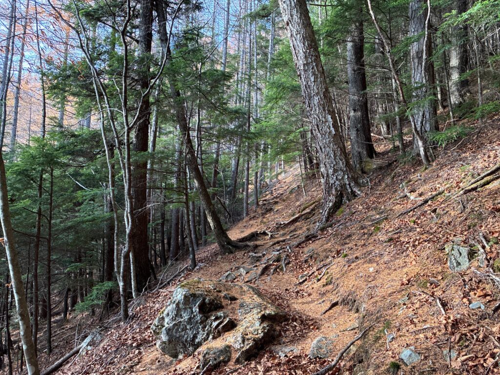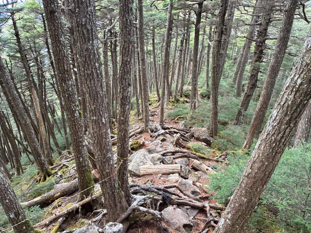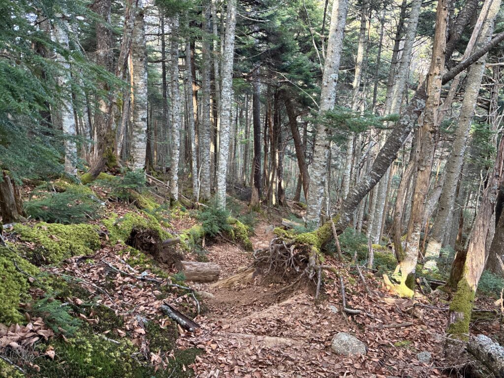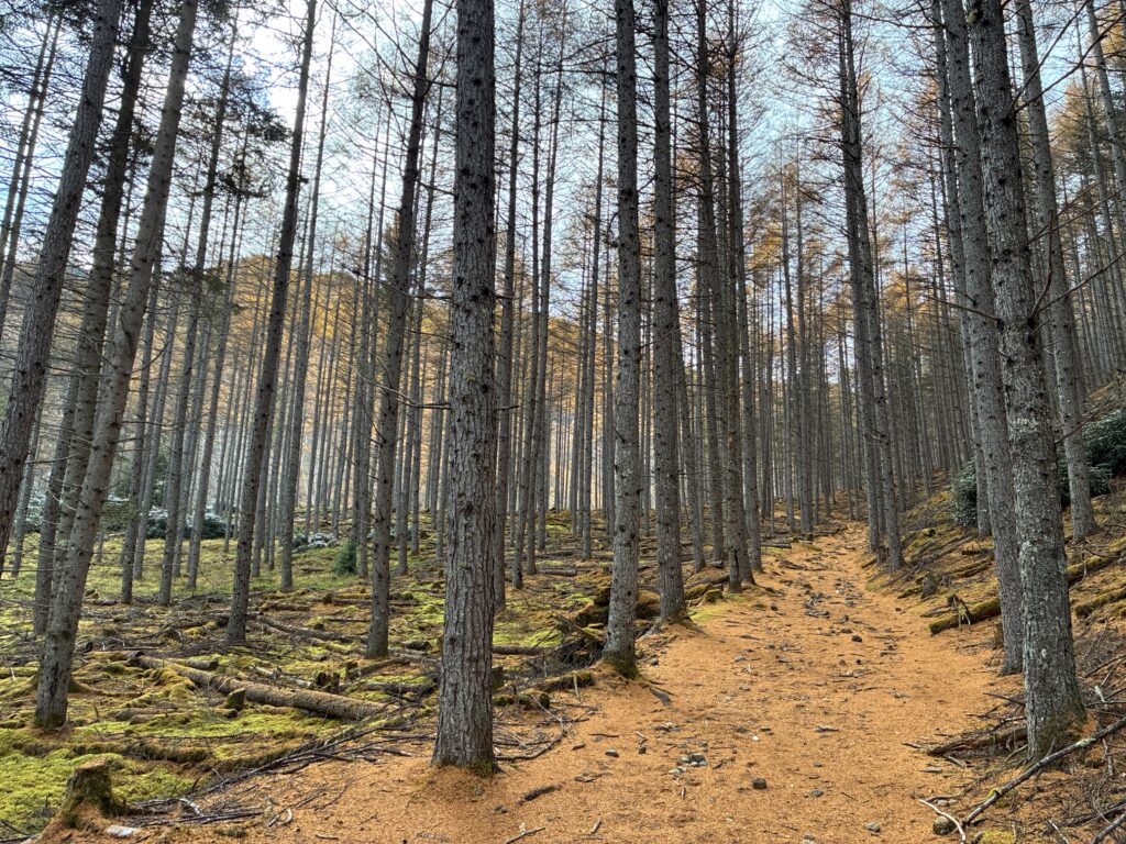 傾斜の緩い道が続き、樹林帯と呼べるほど密でも無く、不思議な感覚です。