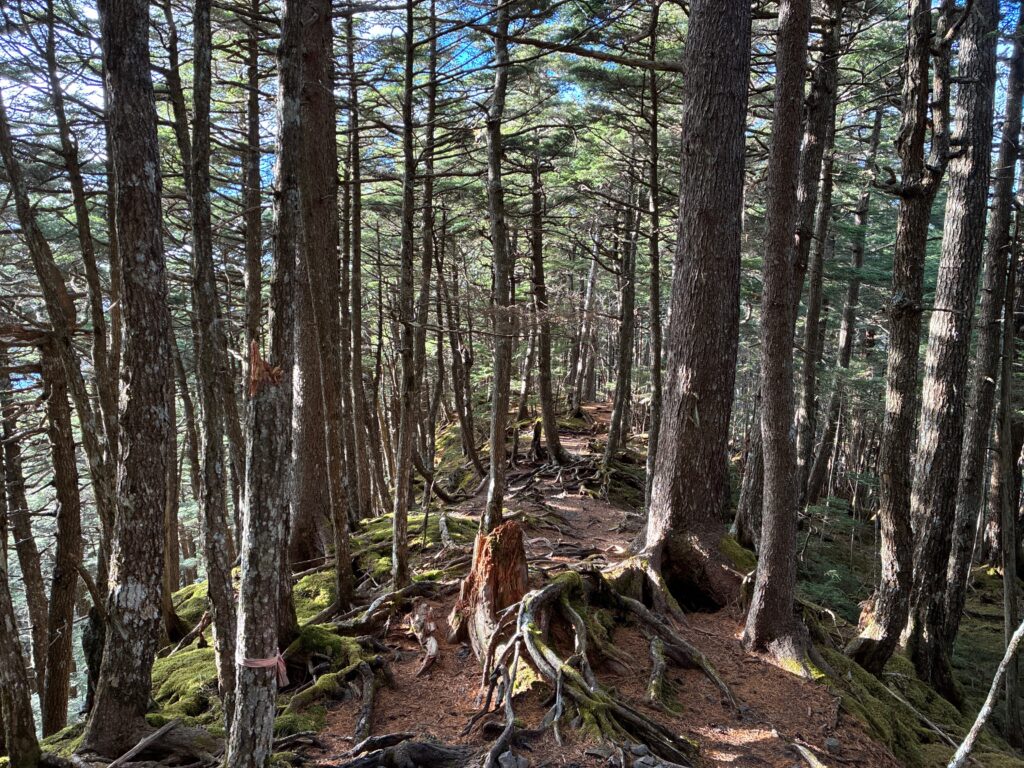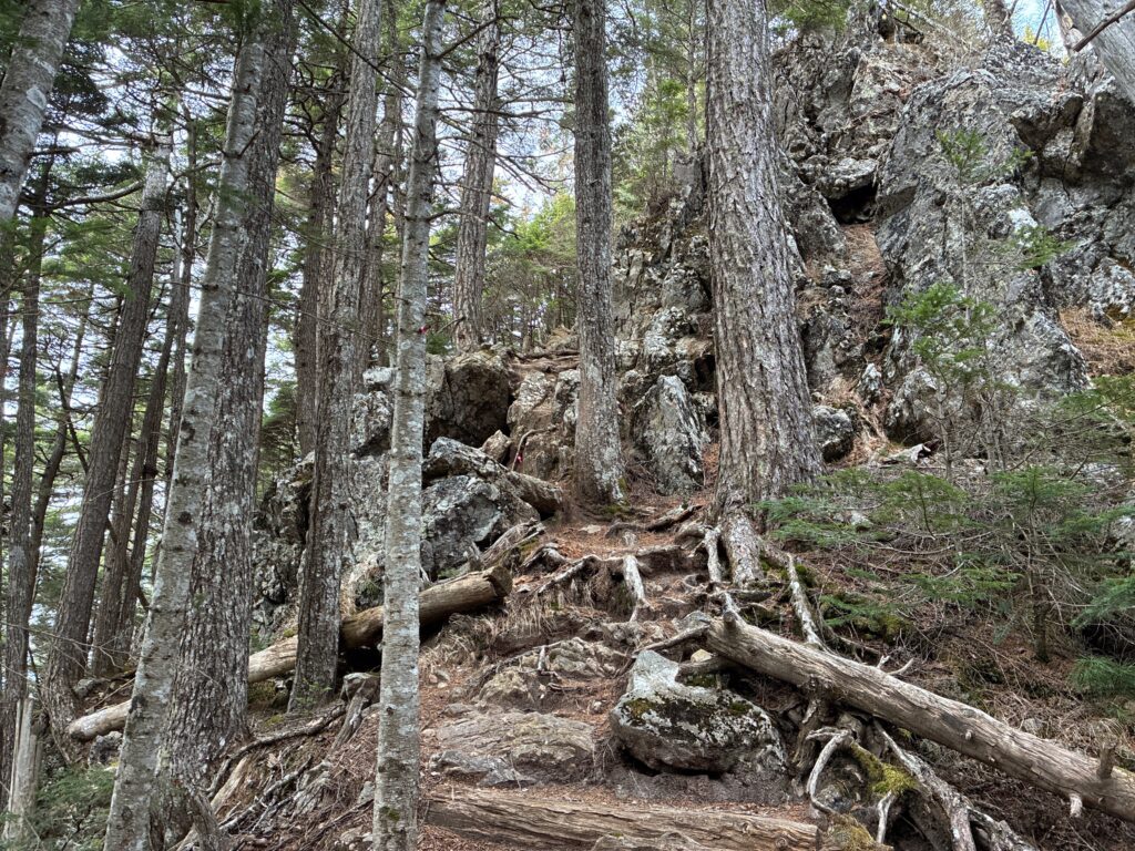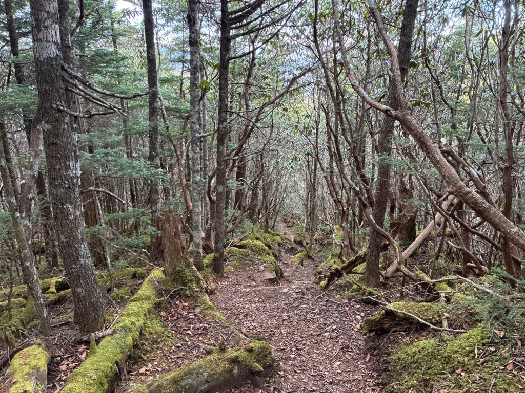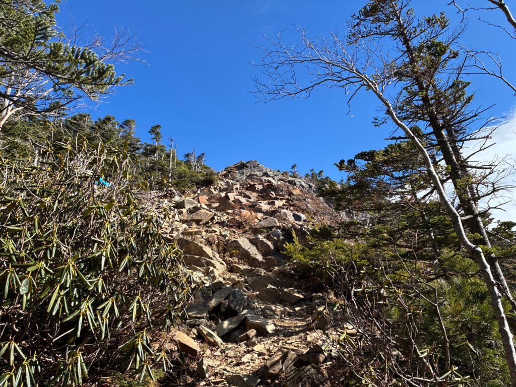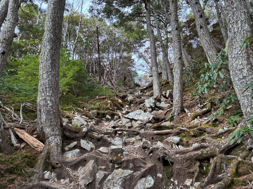 登山道に戻った後は山頂までの急登を登り、徐々に空が見えてきます。