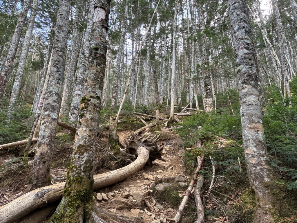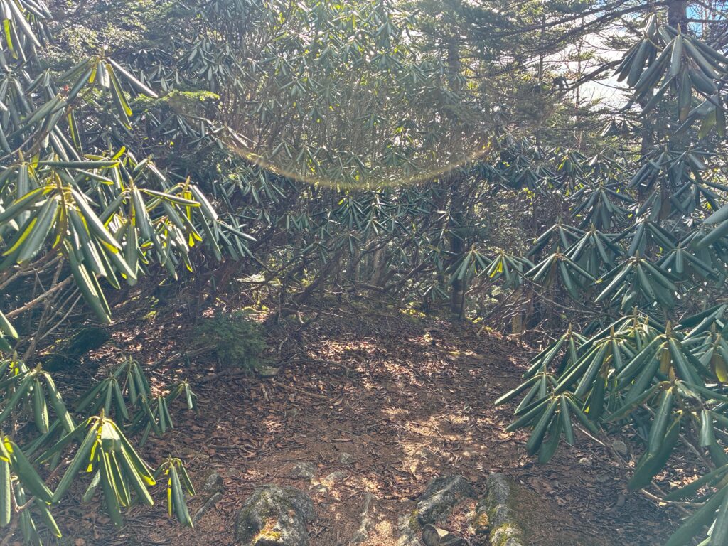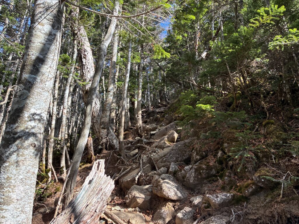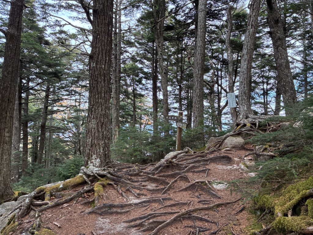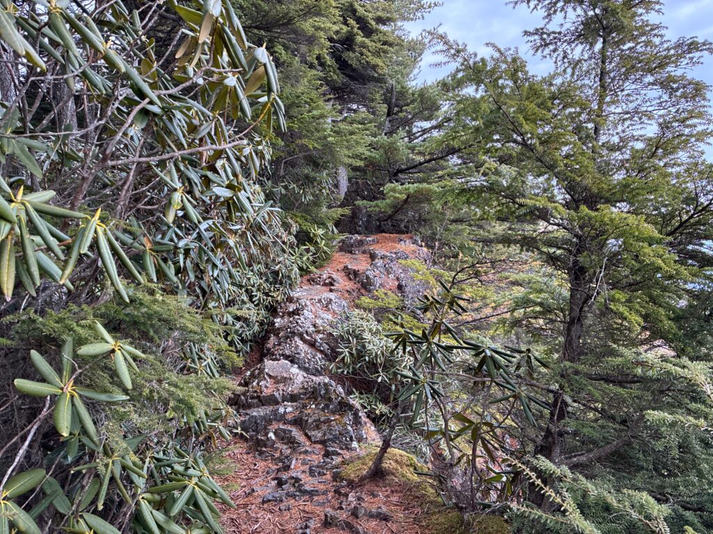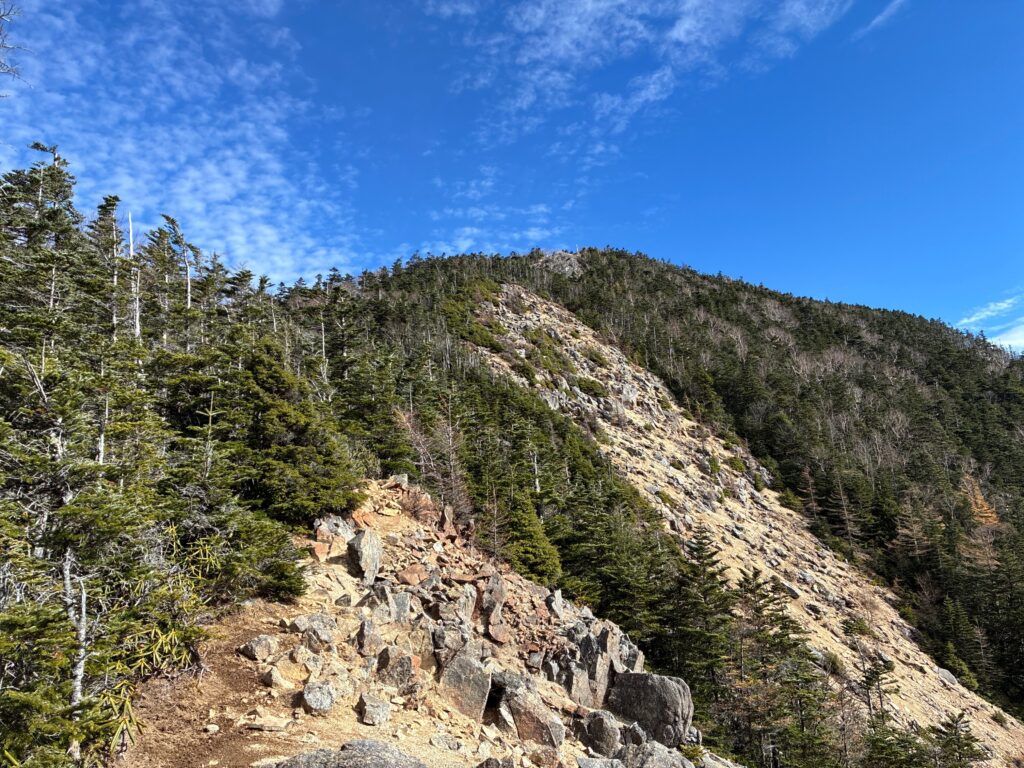 登山道に戻った後は山頂までの急登を登り、徐々に空が見えてきます。
