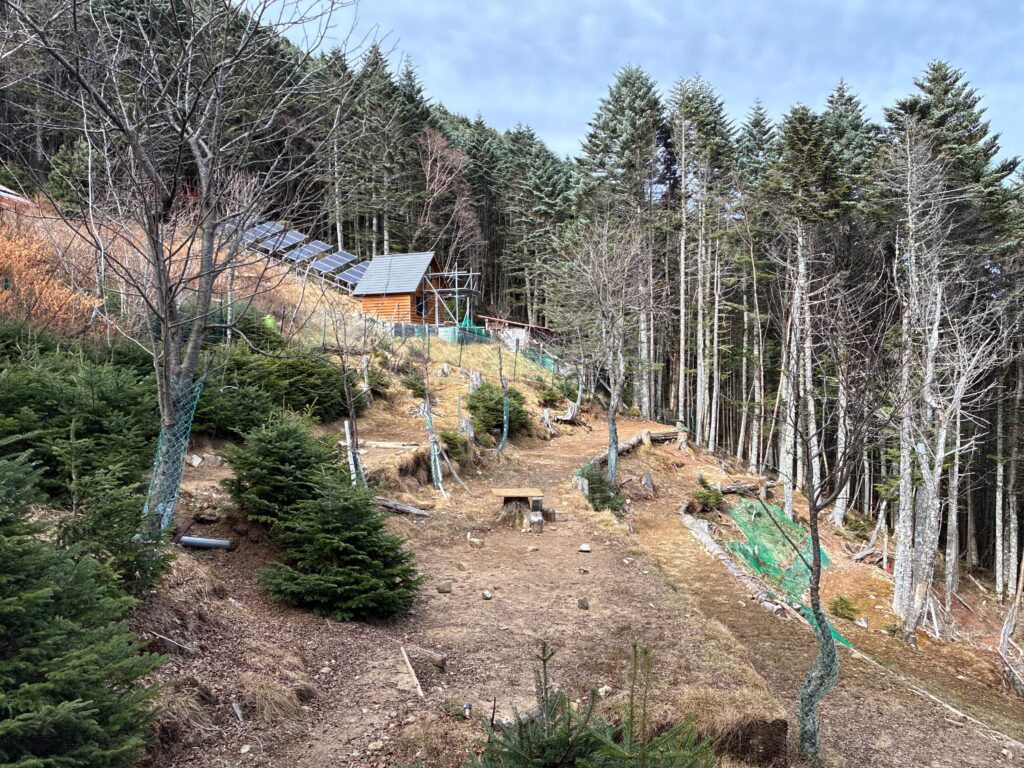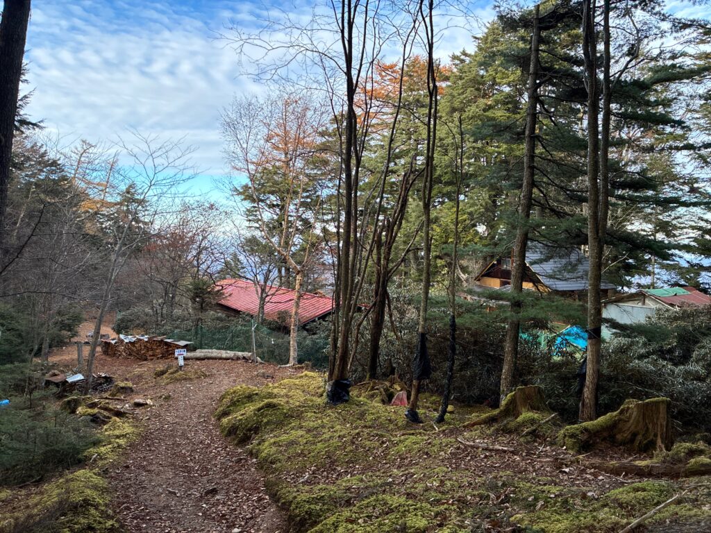 小屋周辺を一通り散策した後は、小屋の脇の道を進んで下山します。