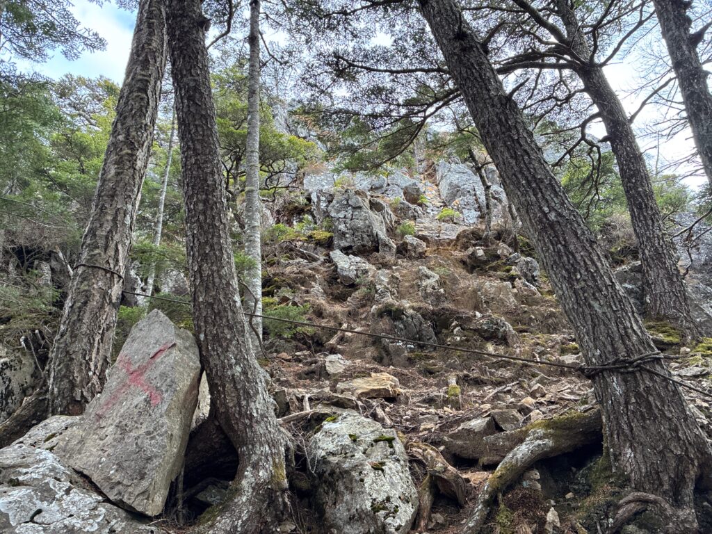山頂は切り立った岩山で、立入禁止のロープが張られています。