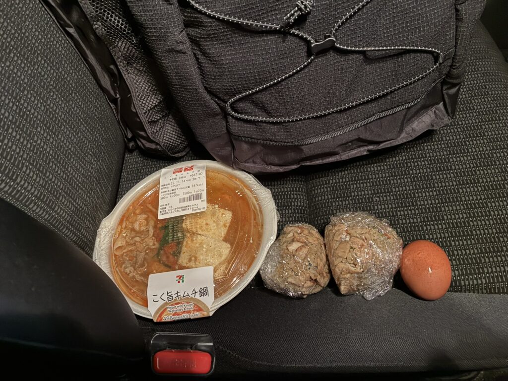 温かいものが食べたくてキムチ鍋(タンパク質22.3g、脂質12.8g)を選択。家で作ってきた鶏むね肉おにぎり、ゆで卵も一緒に食べました。