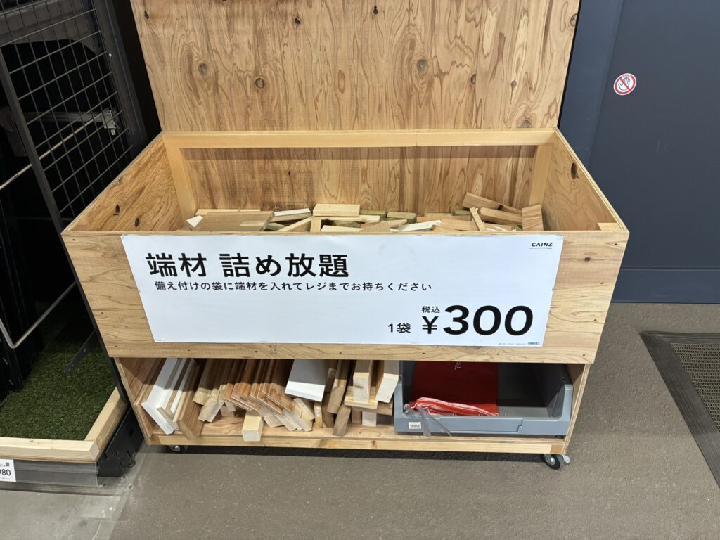 カインズ泉店にはいつもの小割薪は無かったのですが、小型焚火台にちょうど良さそうな端材を見つけ2袋分購入。