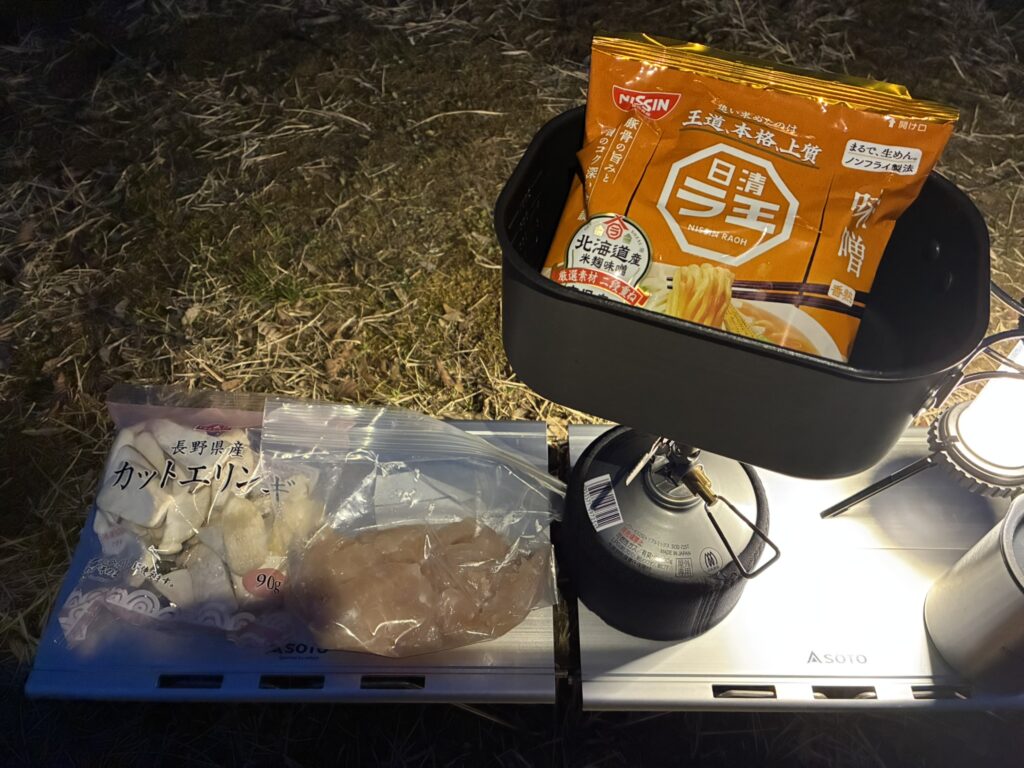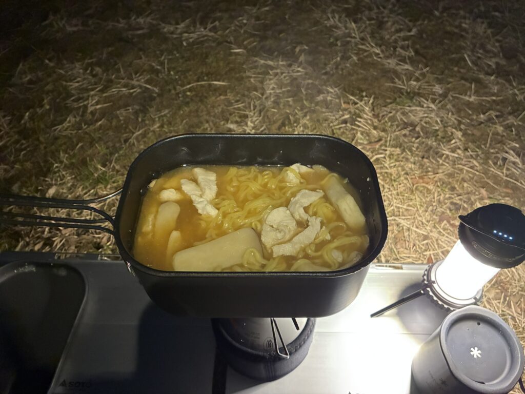 袋ラーメン自体久々でおいしかったですが、鶏むね肉を200g入れたせいもあり、クッカーを持って食べるのが疲れました笑。
