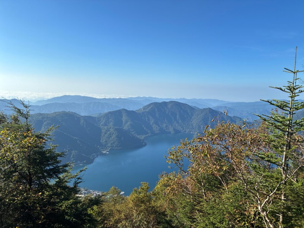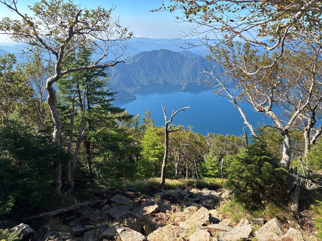 七合目の手前でようやく景観の良いスポットがあり、振り返ると中禅寺湖が見えます。