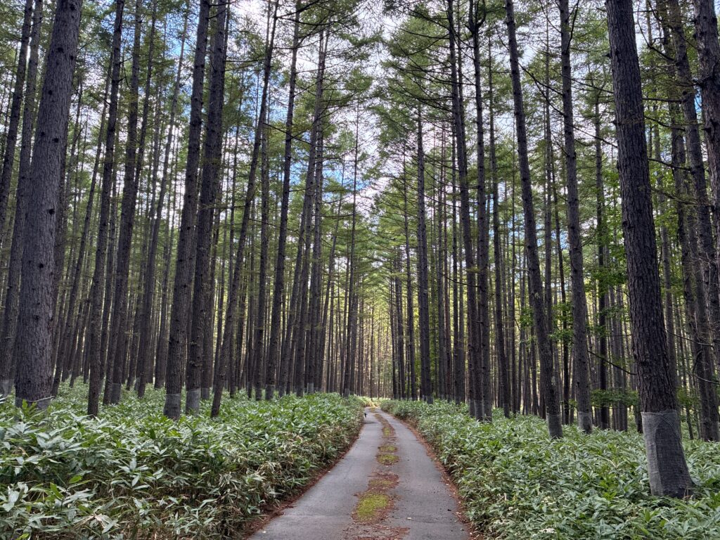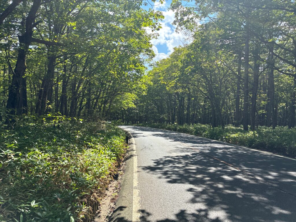 道路の周りには管理された木々が並び、迫力があります。