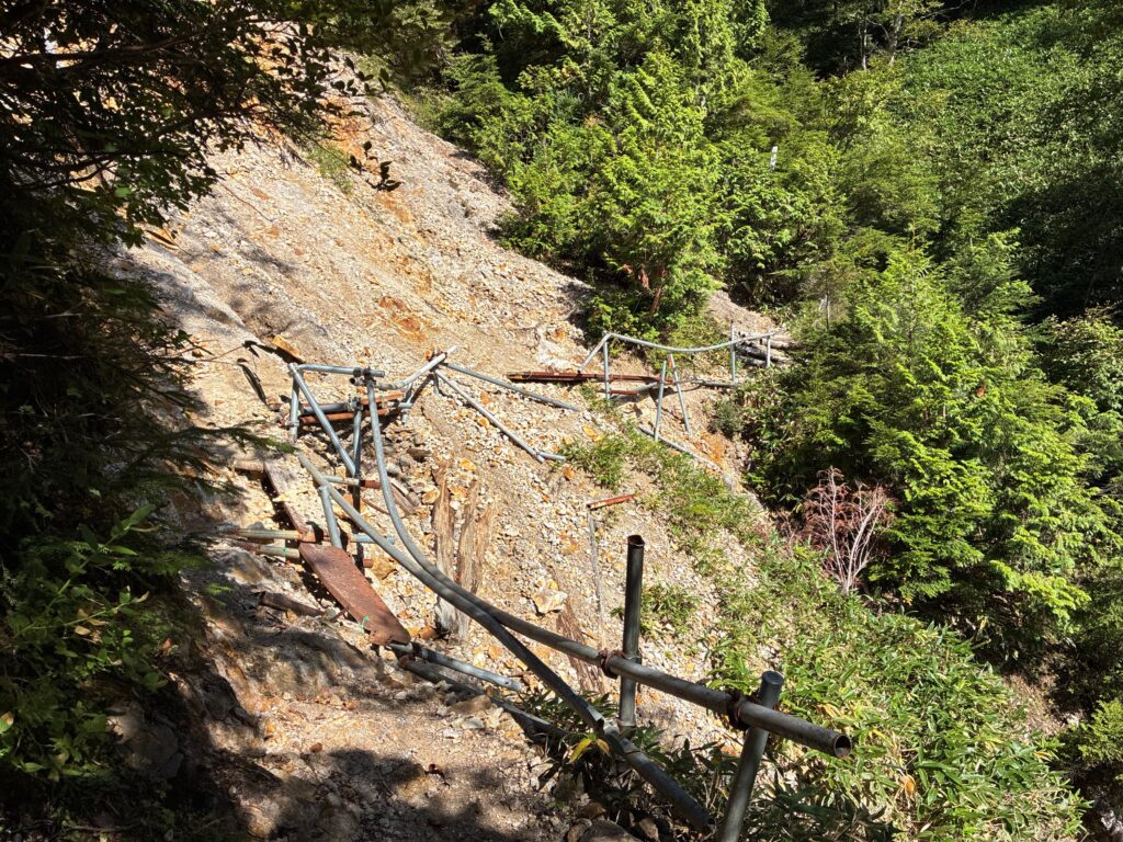 序盤の登りでは足場板が劣化している箇所があり、体重を掛けると沈むため要注意。