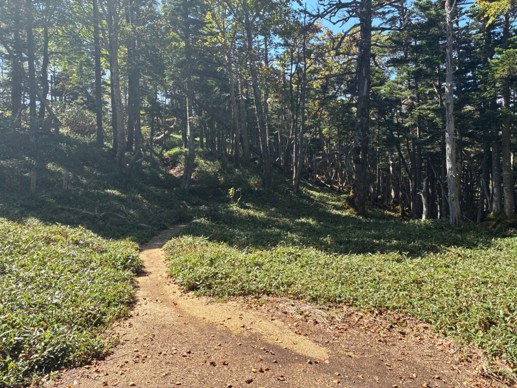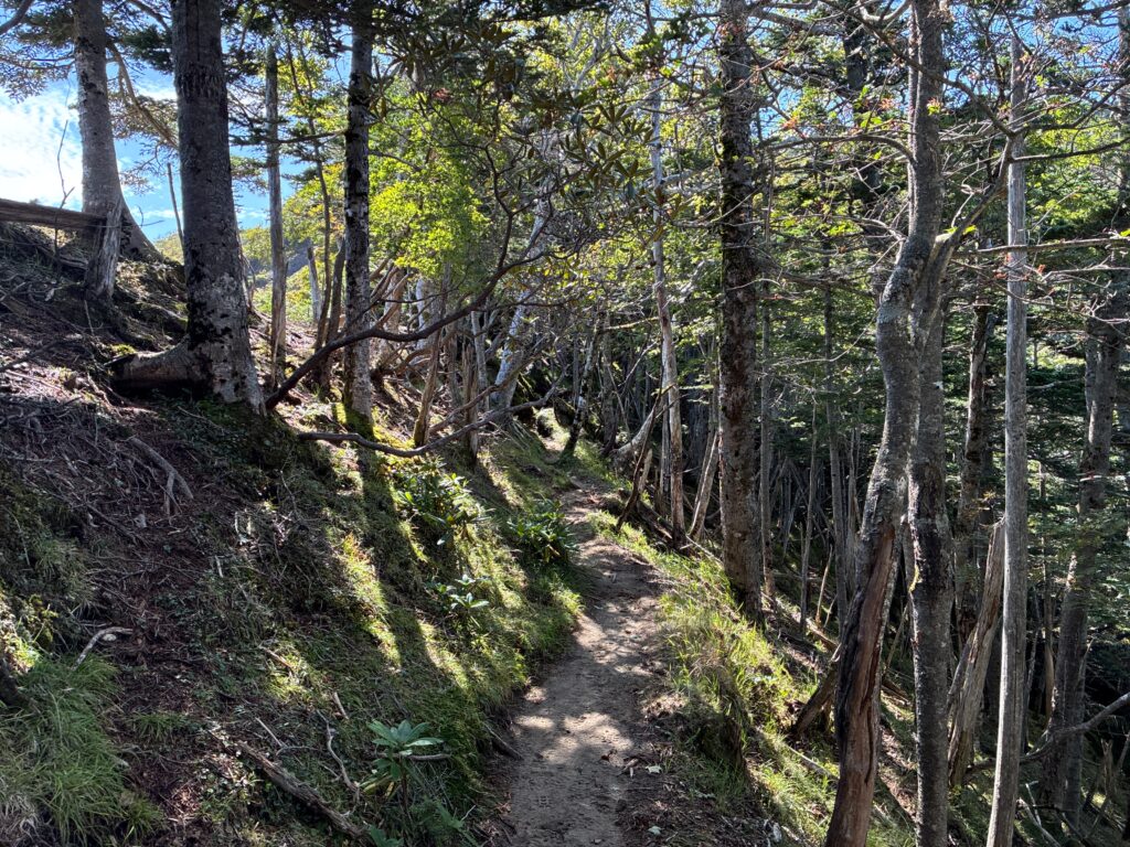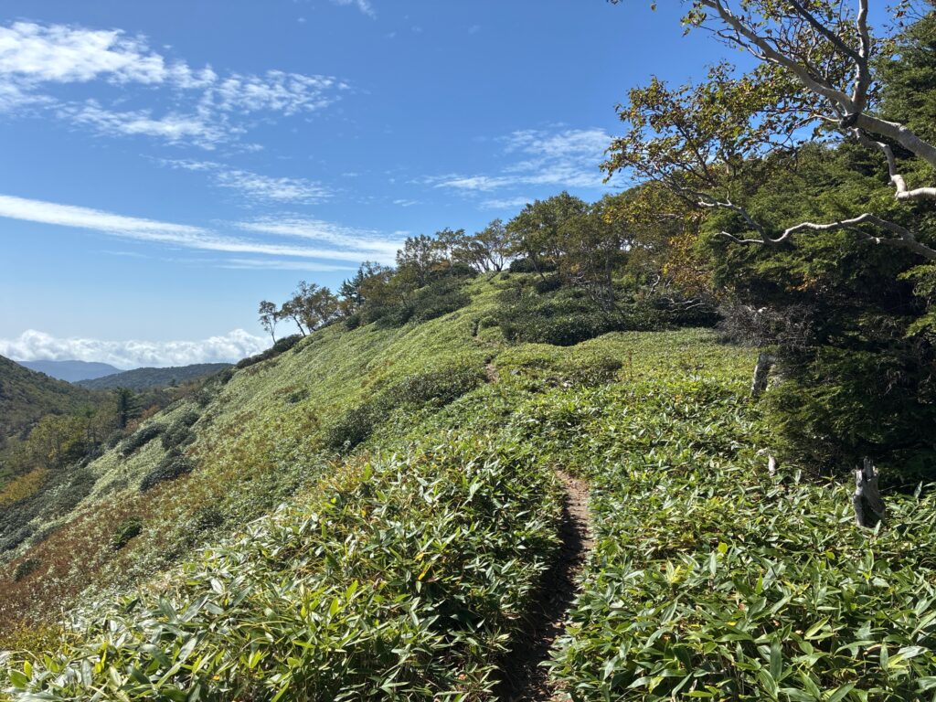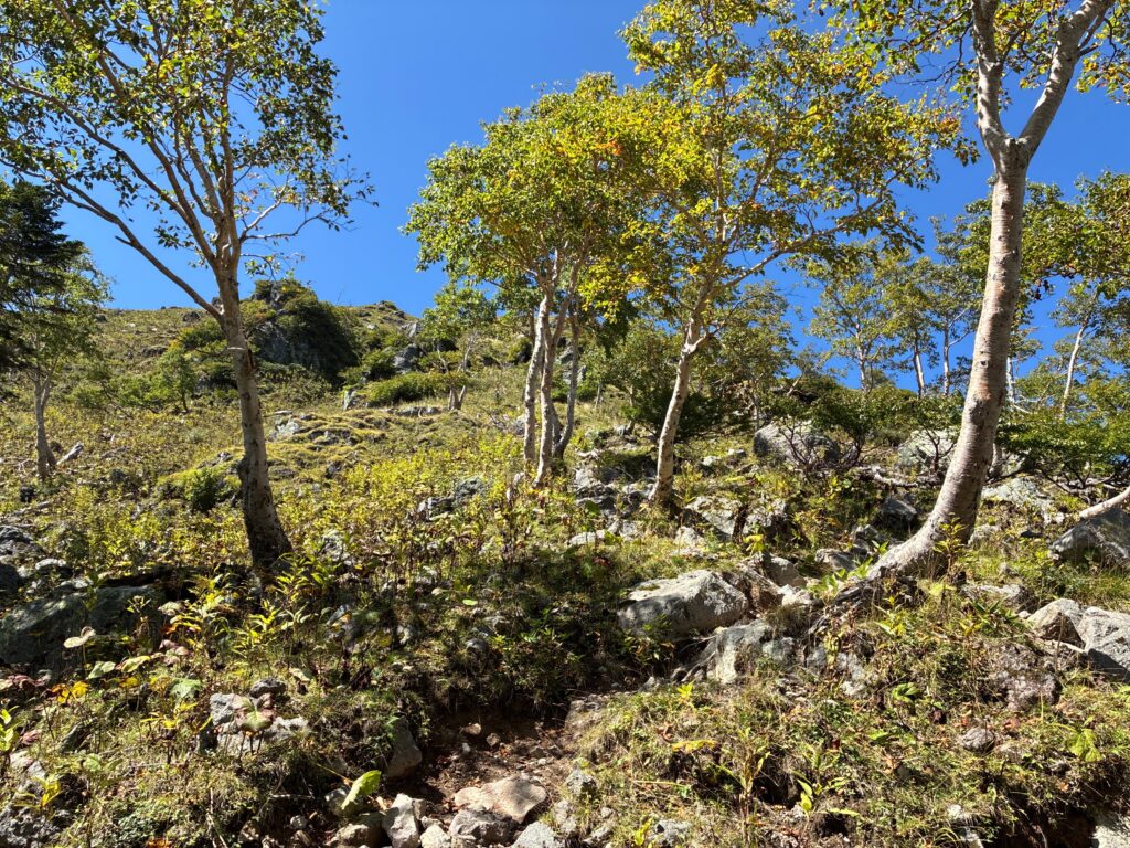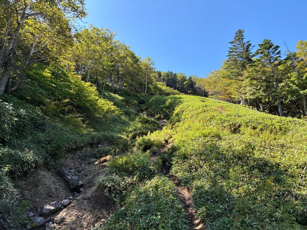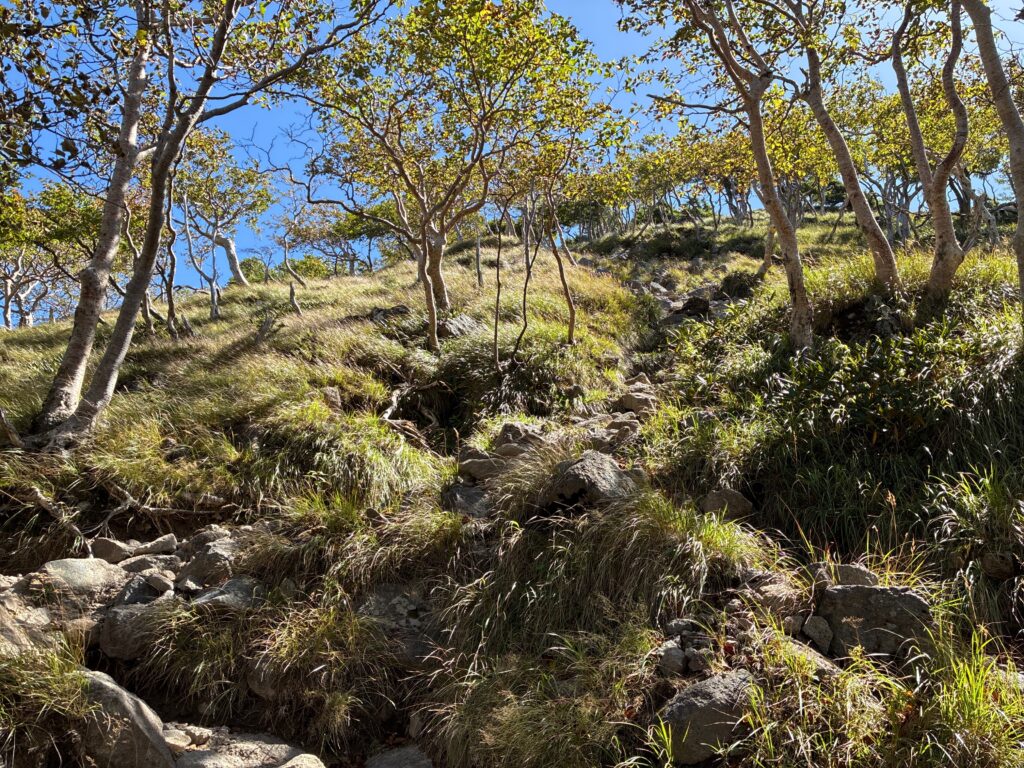 一度下った後は開けた場所の登りがあり、斜面で滑りやすく転びました笑。