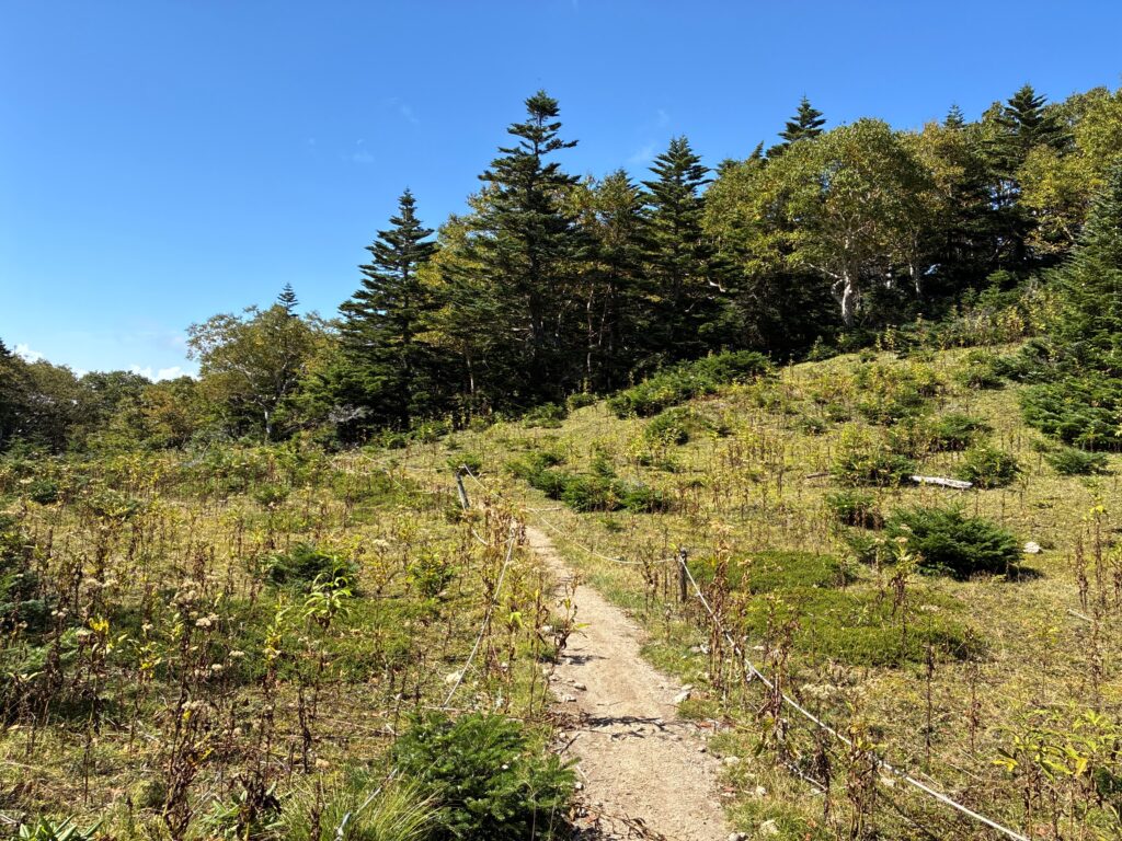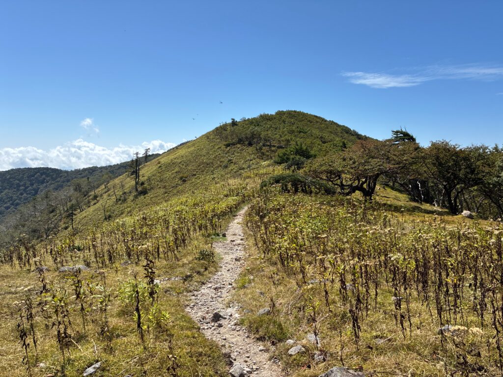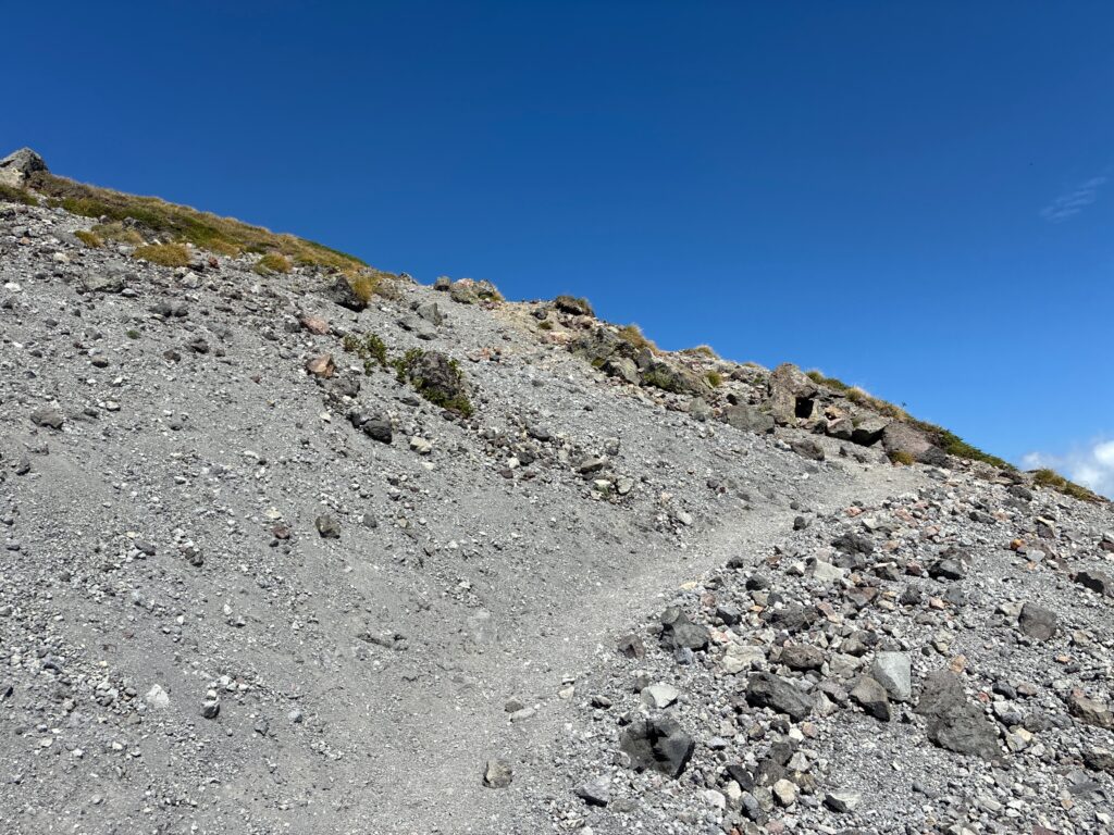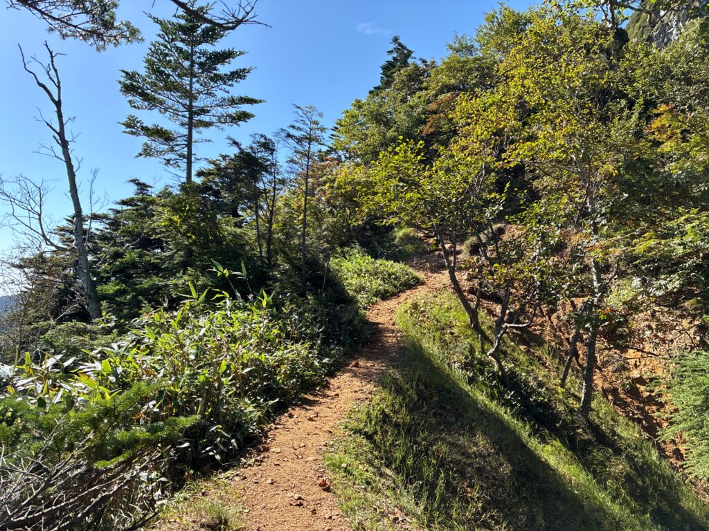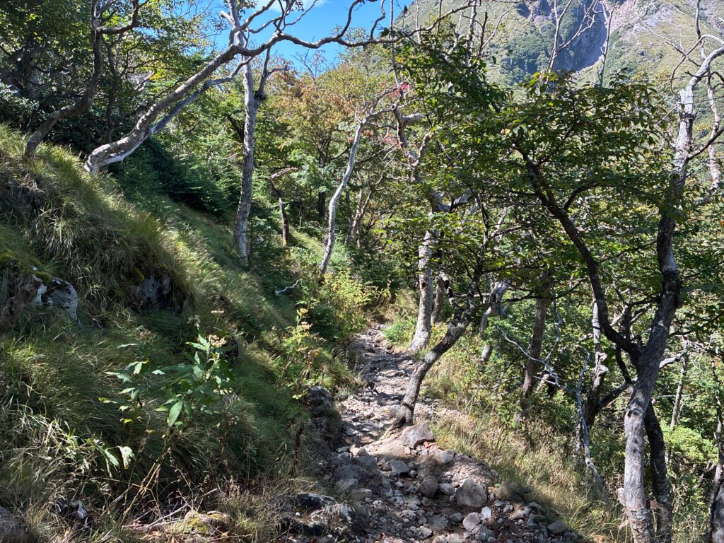 一度下った後は開けた場所の登りがあり、斜面で滑りやすく転びました笑。