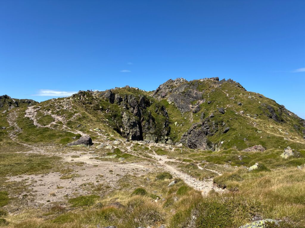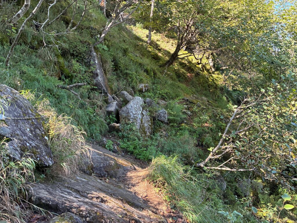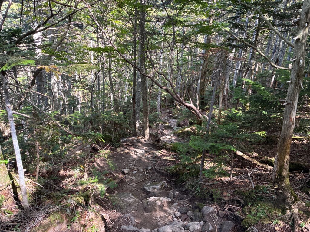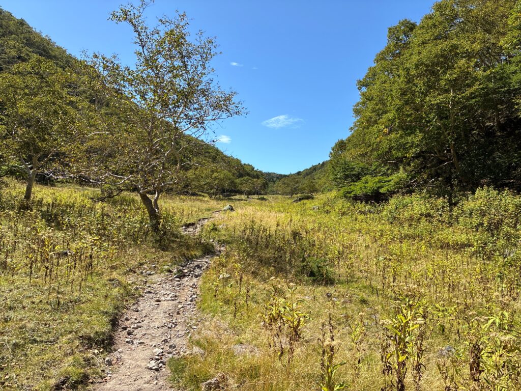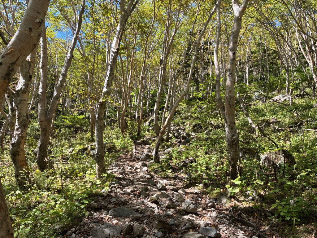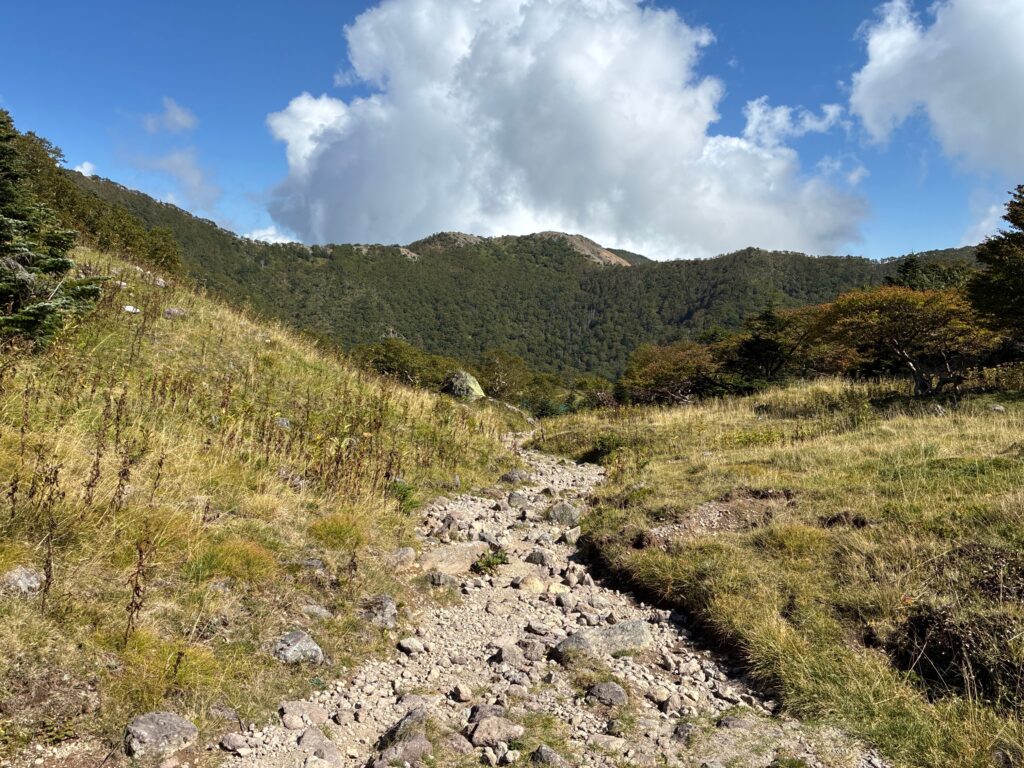 一度下った後は開けた場所の登りがあり、斜面で滑りやすく転びました笑。