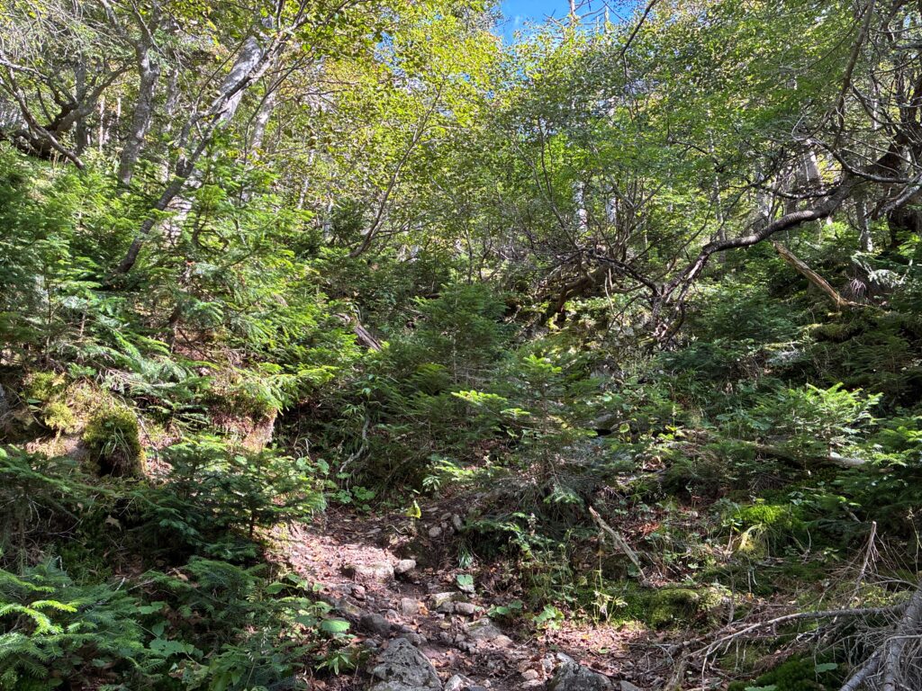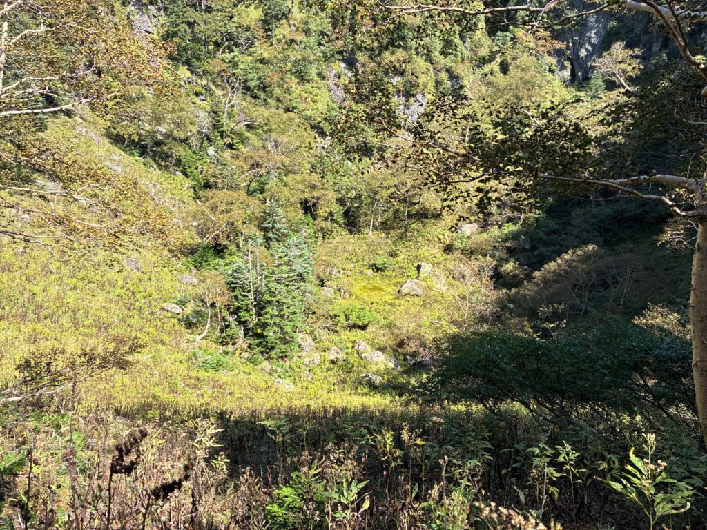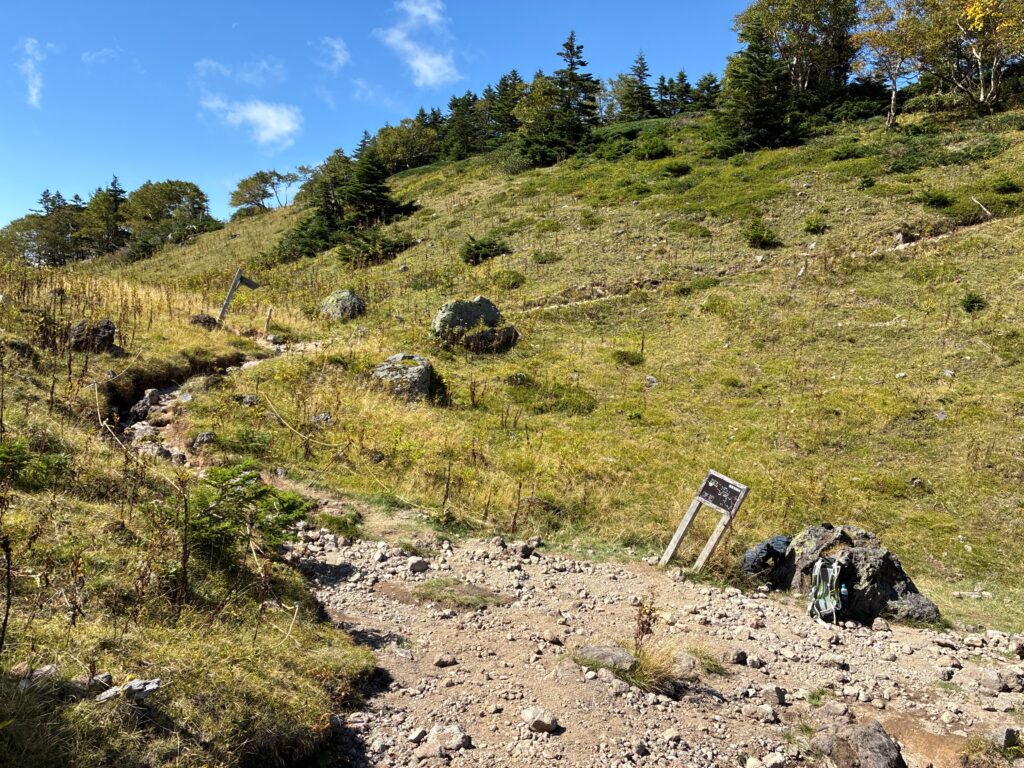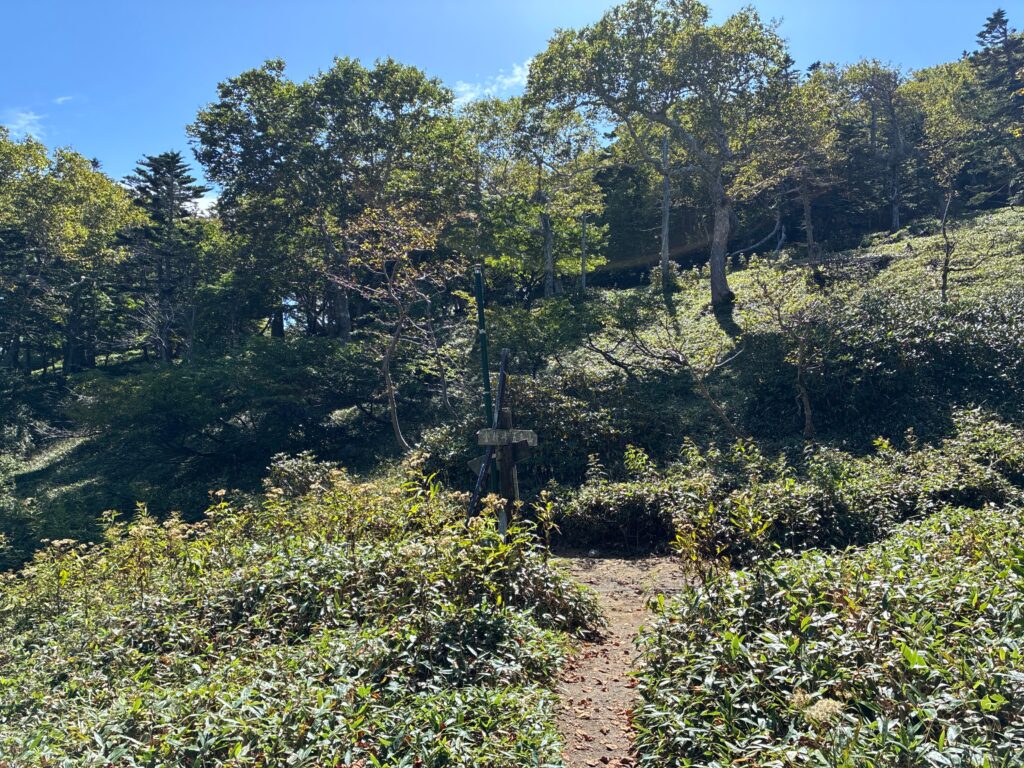 山頂はすり鉢地形の底にあるようで、登り返しは疲れるためここで引き返し…。分岐まで戻り弥陀ヶ池に向かいます。
