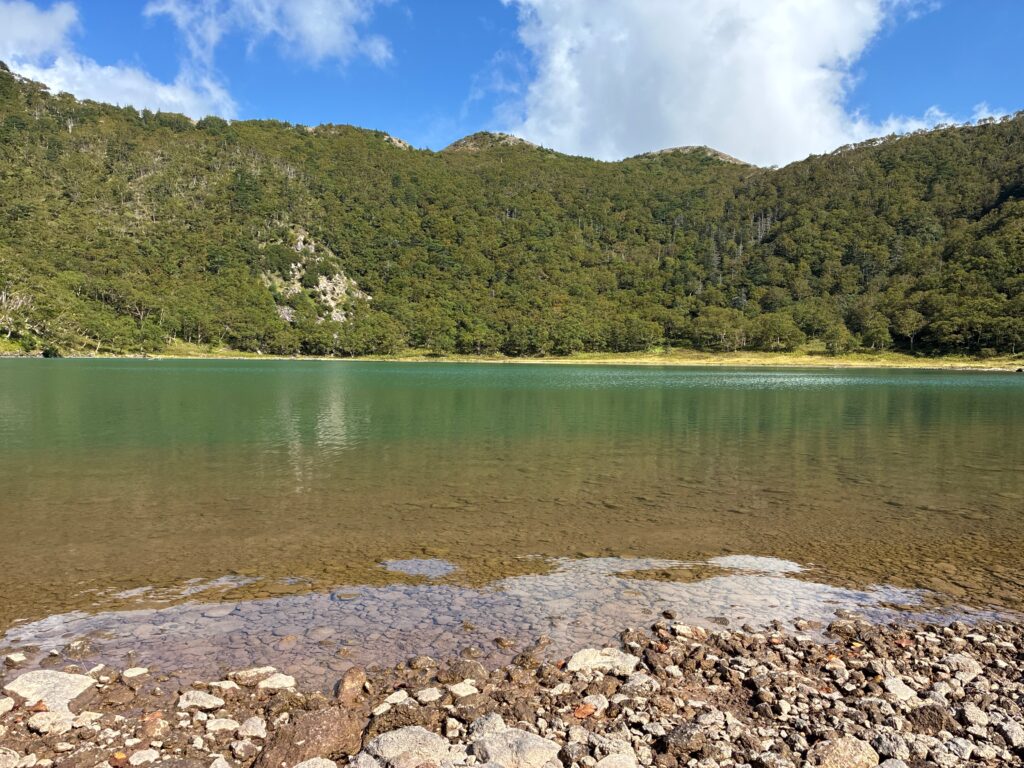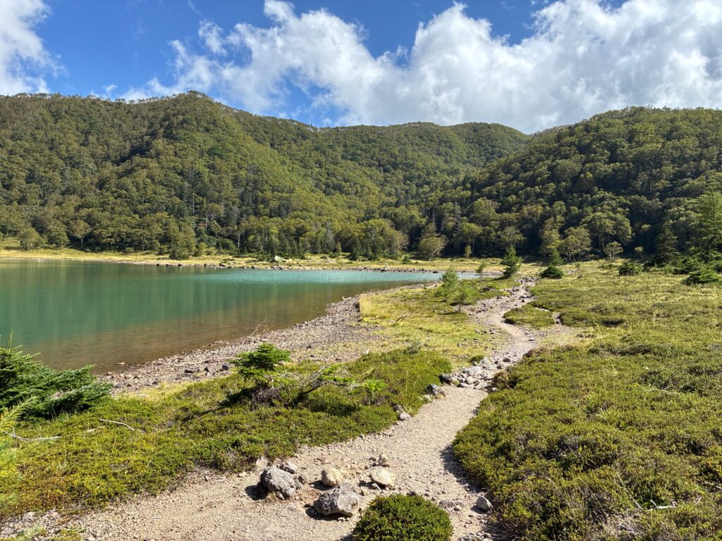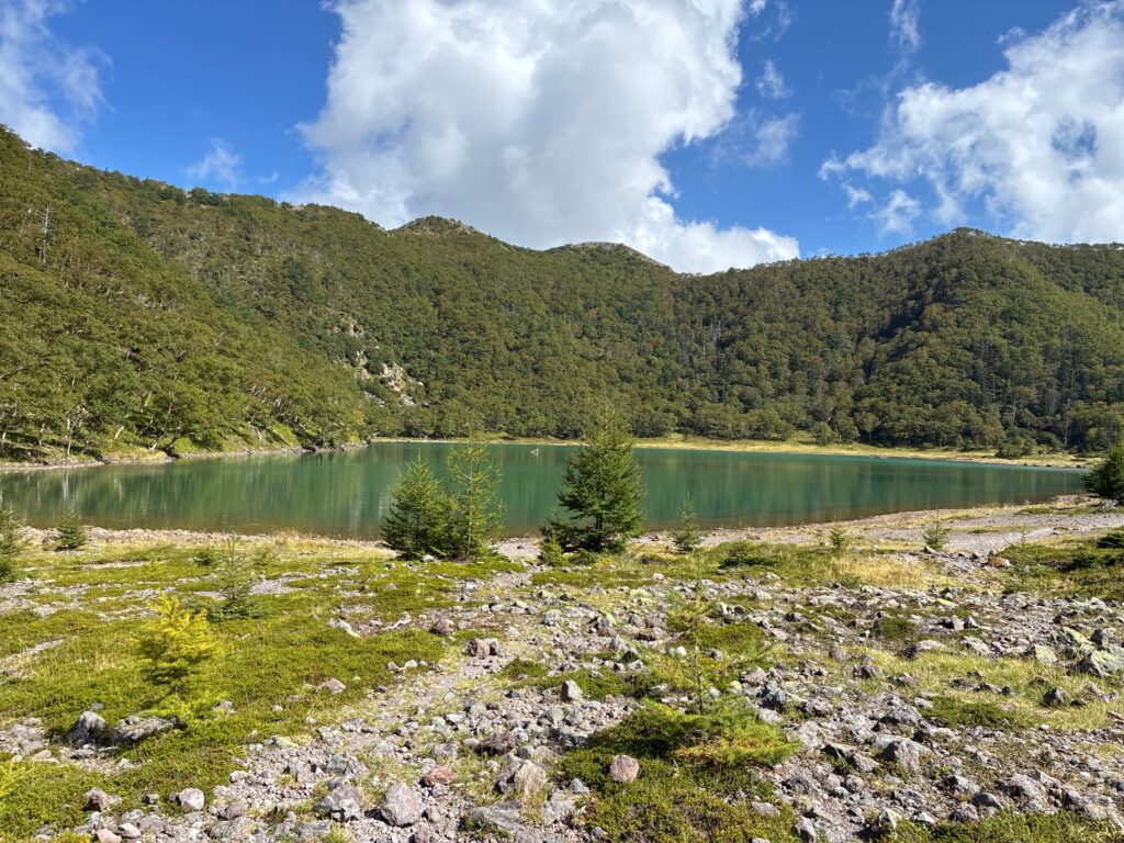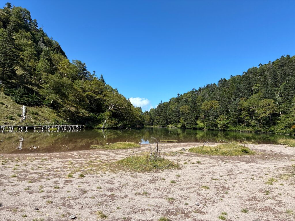 周囲は山に囲まれており、ほとりは海外のロングトレイルで見るような異世界感…!白根山山頂や弥陀ヶ池に比べると人も少なく、雰囲気を存分に楽しめます。