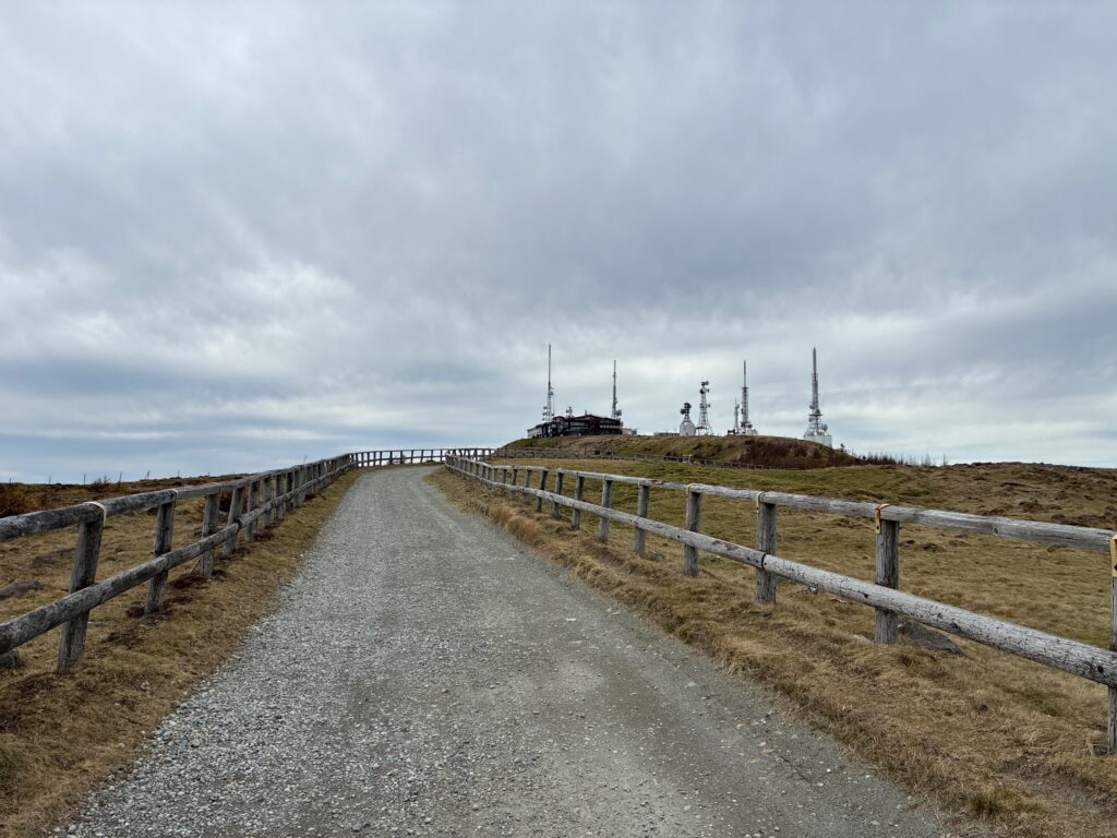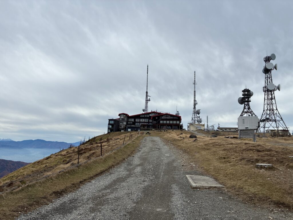さらに遊歩道を歩き続けると、王ヶ頭山頂のホテルと塔のようなものが見えてきます。