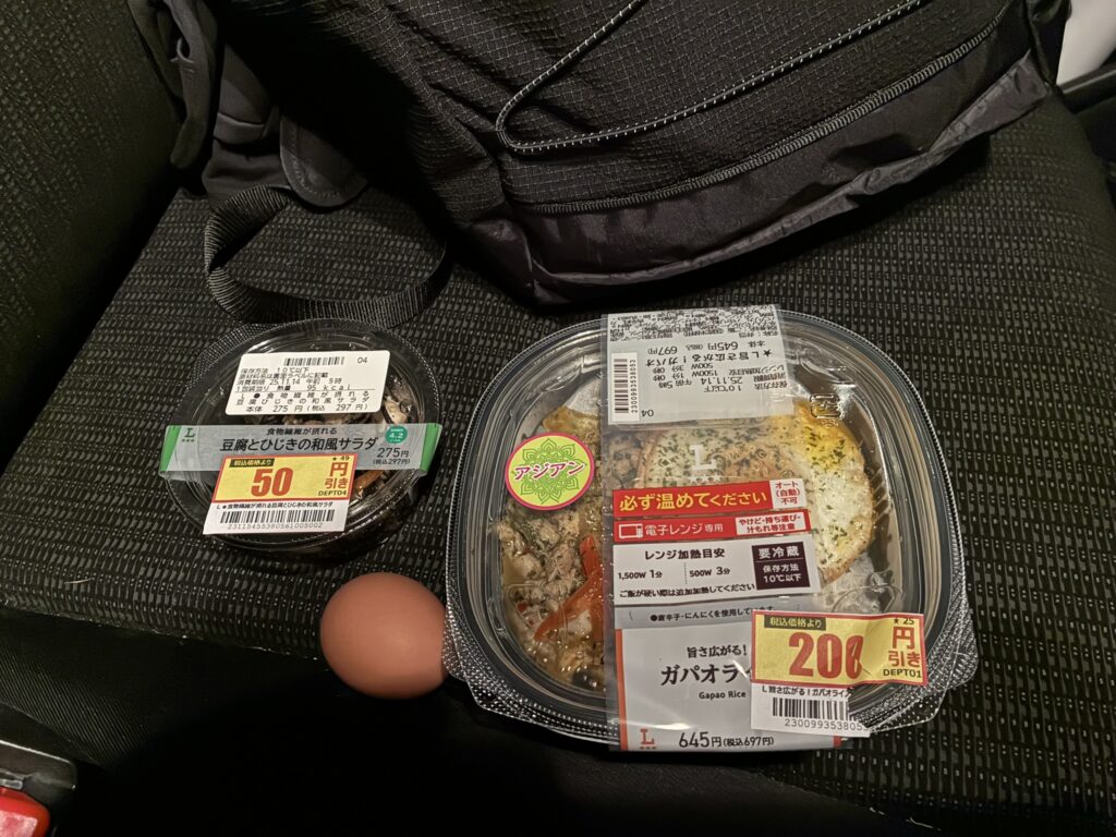 高タンパク、低脂質のガパオライスとひじきのサラダ。どちらも割引あり!忘れていたゆで卵もここで食べます。